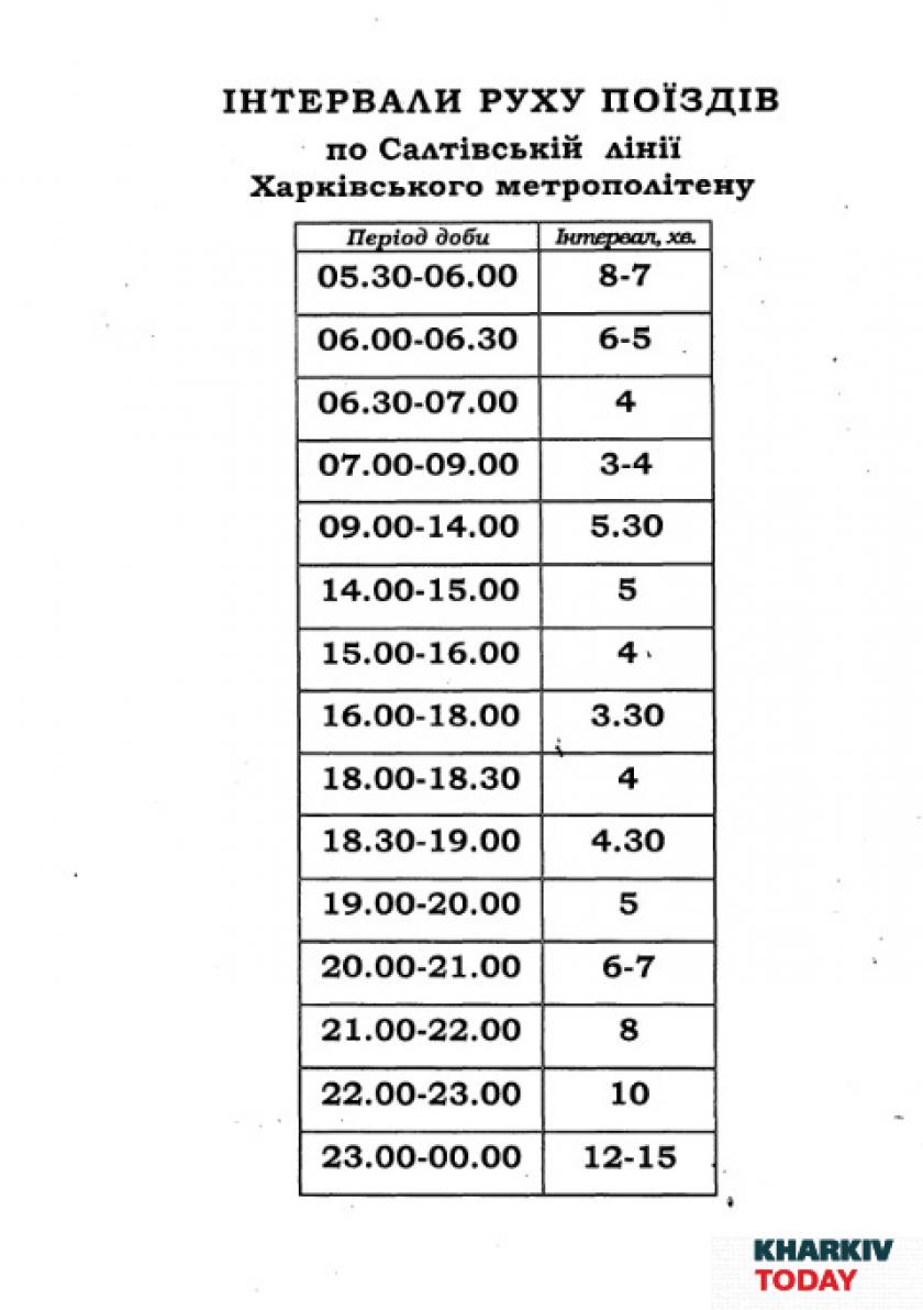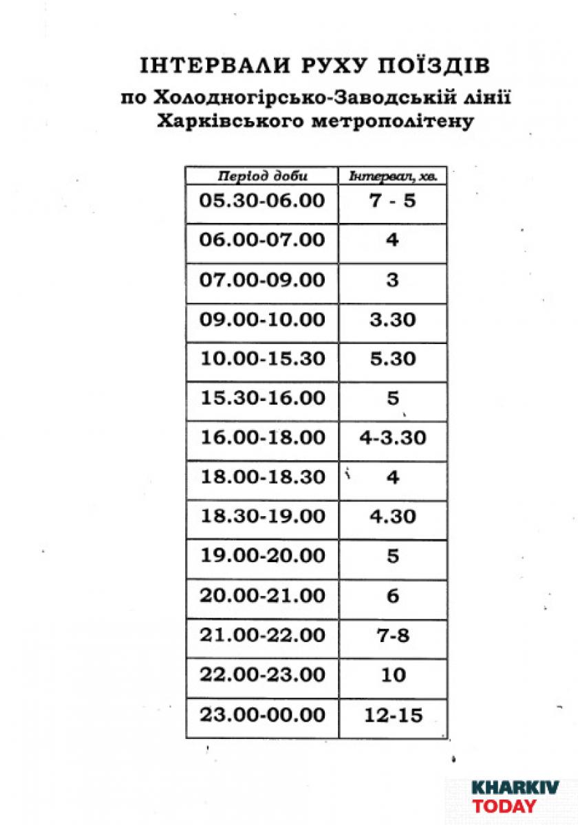 После 18.00 интервал движения поездов увеличивается на всех трех линиях Харьковского метрополитена. Максимальный интервал составляет 15 минут в период с 23.00 до 24.00.