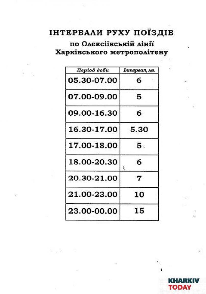 Согласно графику, интервал движения поездов утром с 5.30 до до 6.00 составляет семь-восемь минут на Салтовской линии метрополитена, на Холодногорской линии в это время поезда двигаются с интервалом в пять-семь минут. На Алексеевской линии интервал движения поездов составляет шесть минут.