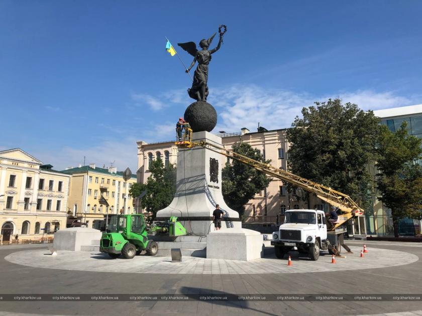 Сотрудники специализированного предприятия "Харьковзеленстрой" ко Дню города очищают от грязи и пыли памятники Харькова.