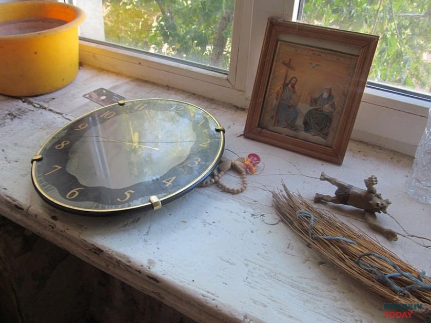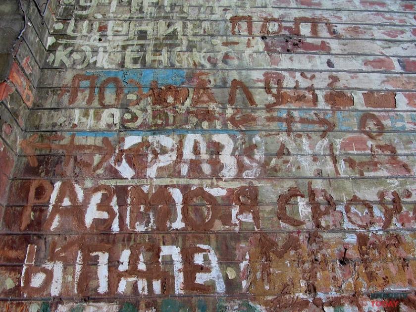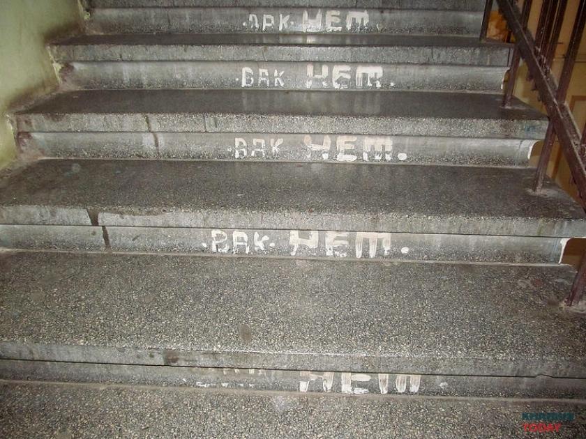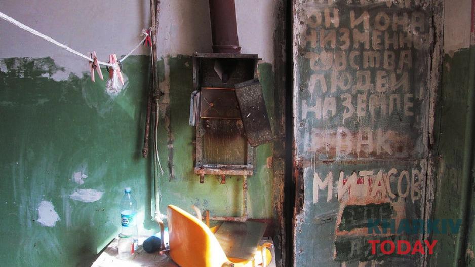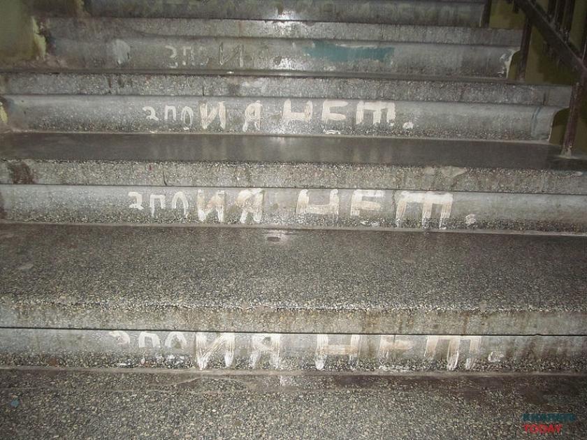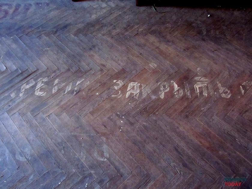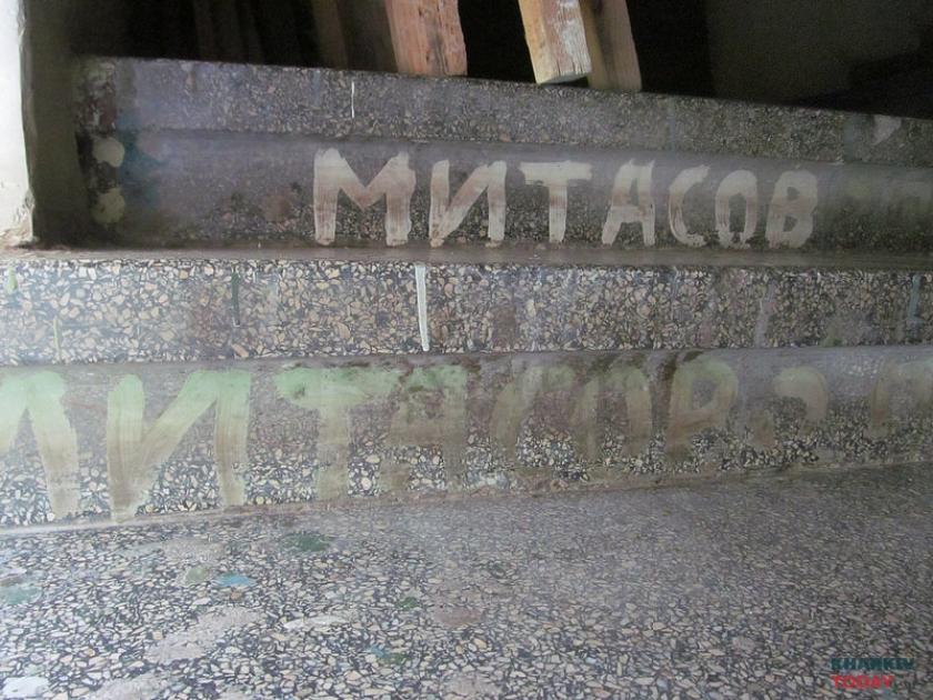 В помещении как будто пытались начать ремонт: в части оконных проемов, например, вставлены пластиковые рамы. Дальше, впрочем, дело не двинулось. На одном из новых подоконников пылятся остановившиеся часы, две хрустальные рюмки и икона. Взгляд останавливается на полу, усыпанном битым стеклом и яичной скорлупой со шприцем. На кухне наконец замечаем сохранившийся артефакт – дверь, исписанную в знакомом стиле. «ОН И ОНА НИЗМЕННЫ ЧУВСТВА ЛЮДЕЙ НА ЗЕМЛЕ ВАК МИТАСОВ». За дверью открывается гигантское пространство и лестница, ведущая в никуда. Как в фильме ужасов.