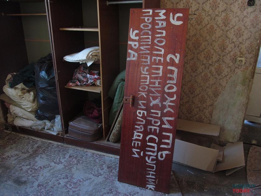 В одной из комнат обнаруживаем еще одну реликвию – исписанную белой краской дверцу шкафа с надписью "У..ЧТОЖИТЬ МАЛОЛЕТНИХ ПРЕСТУПНИКОВ ПРОСТИТУТОК И БЛЯДЕЙ УРА". Хозяин квартиры сам признается, что в ней жил Митасов – нам даже не приходится задавать заранее заготовленные наводящие вопросы.