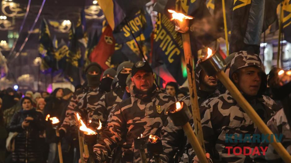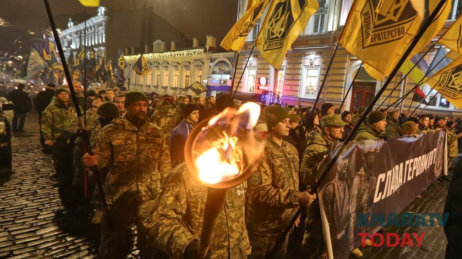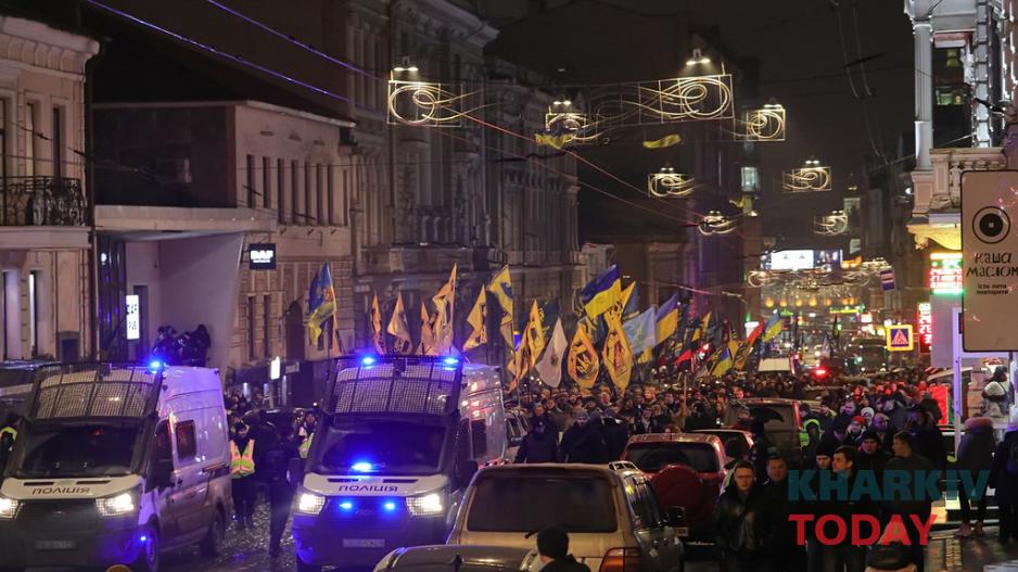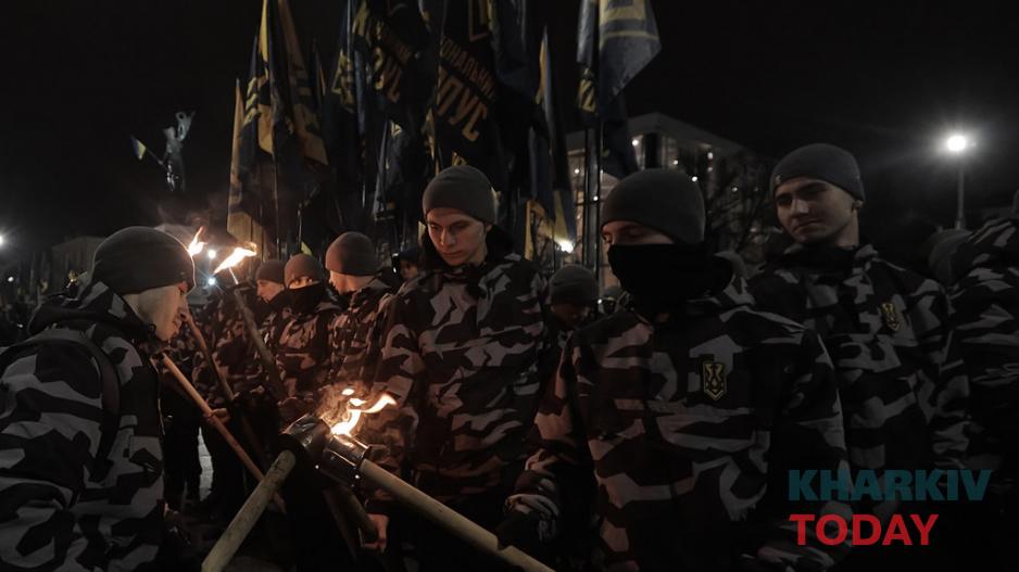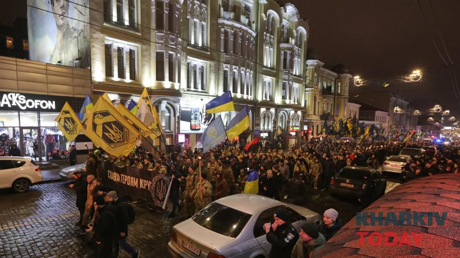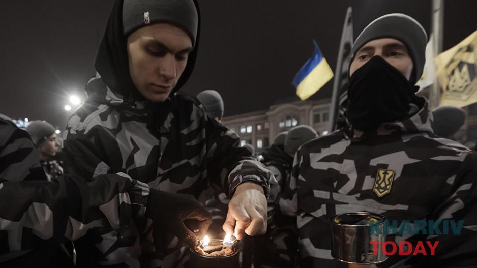 Вечером 29 января шествие началось на площади Конституции. Две тысячи человек зажгли факелы и пошли по Сумской под флагами "Национального корпуса" и "Демократичної сокири". Участники марша за полчаса дошли до Харьковской филармонии, где представители общественных организаций вручили награды участникам АТО, которые ушли на войну студентами.