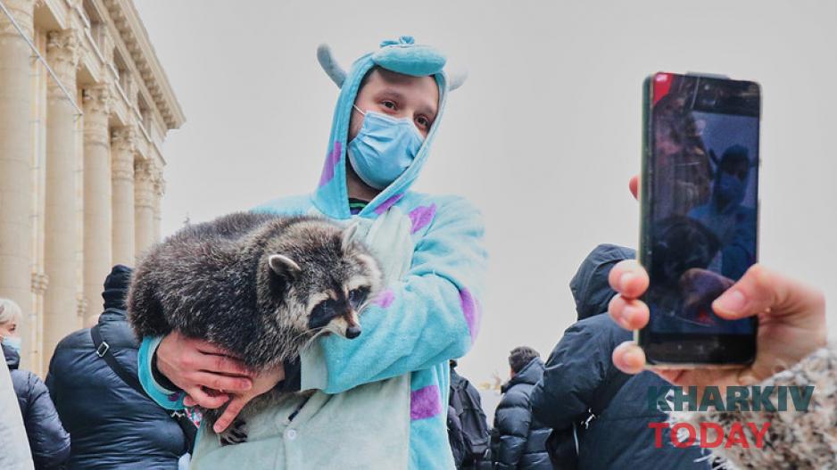 6 ноября под здание Харьковской областной государственной администрации вышли несколько сотен представителей сферы общественного питания - бармены, официанты, рестораторы, владельцы кафе и ресторанов. К группе поддержки митингующих присоединился енот по имени Лиза из кафе с енотами.