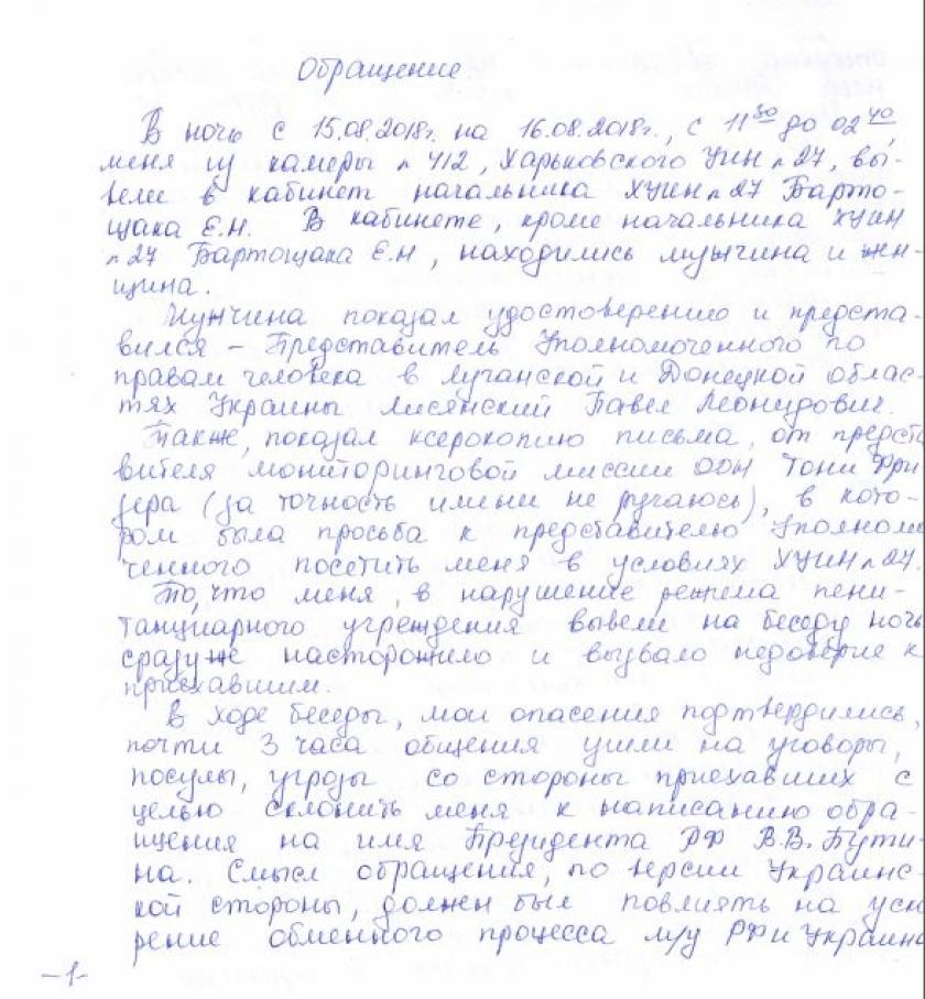 Лариса Чубарова сообщила, что поучаствовать в обмене ей предложили Представитель уполномоченного Верховной Рады по правам человека в Луганской и Донецкой областях Павел Лисянский и неизвестная женщина. По словам Чубаровой, ради этого они приезжали к ней ночью в харьковское СИЗО. Разговор состоялся в ночь с 15 на 16 августа этого года в кабинете начальника ХУИН № 27 и длился три часа. Чубарова отметила, что все это время ее уговаривали написать обращение к Президенту РФ Владимиру Путину с просьбой обменять ее на украинцев. Однако она отказалась.