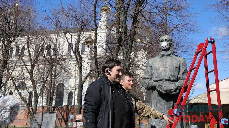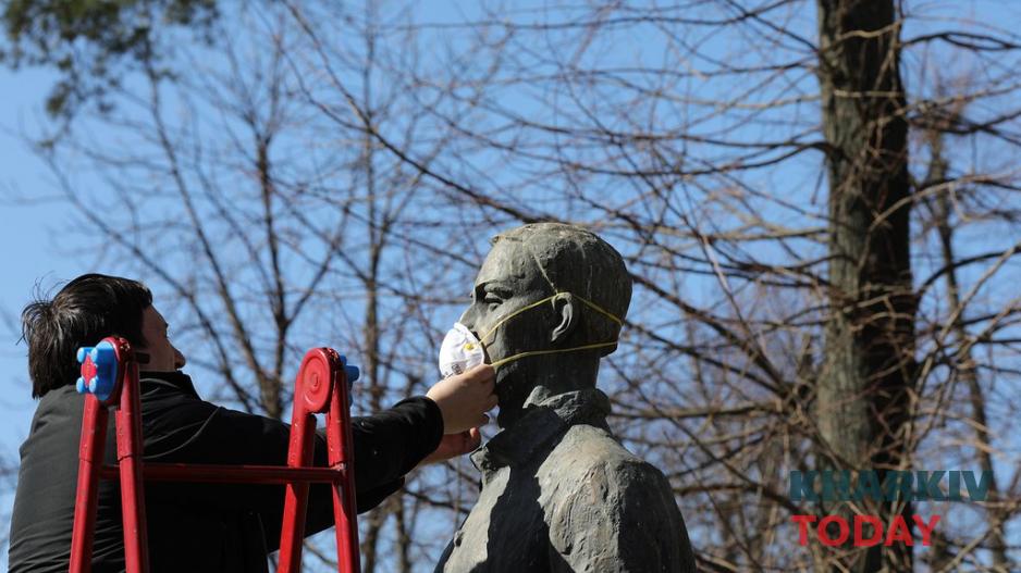 На лицо бронзового изваяния философа Григория Сковороды по улице Университетской надели защитную маску. На флешмоб "К коронавирусу с мудростью" пришли около 10 человек, которых научили самостоятельно делать маски.