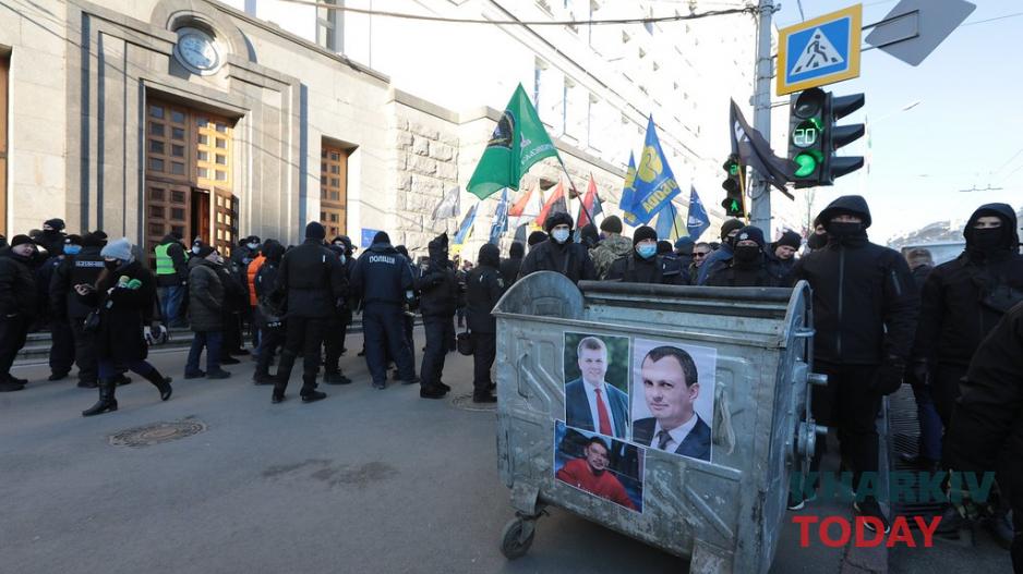 Перед началом сессии депутатов встретил пикет представителей патриотических сил, которые прикатили к двери мэрии мусорные баки, чтобы наглядно продемонстрировать готовность к мусорной люстрации тех, кто будет предавать интересы Украины.