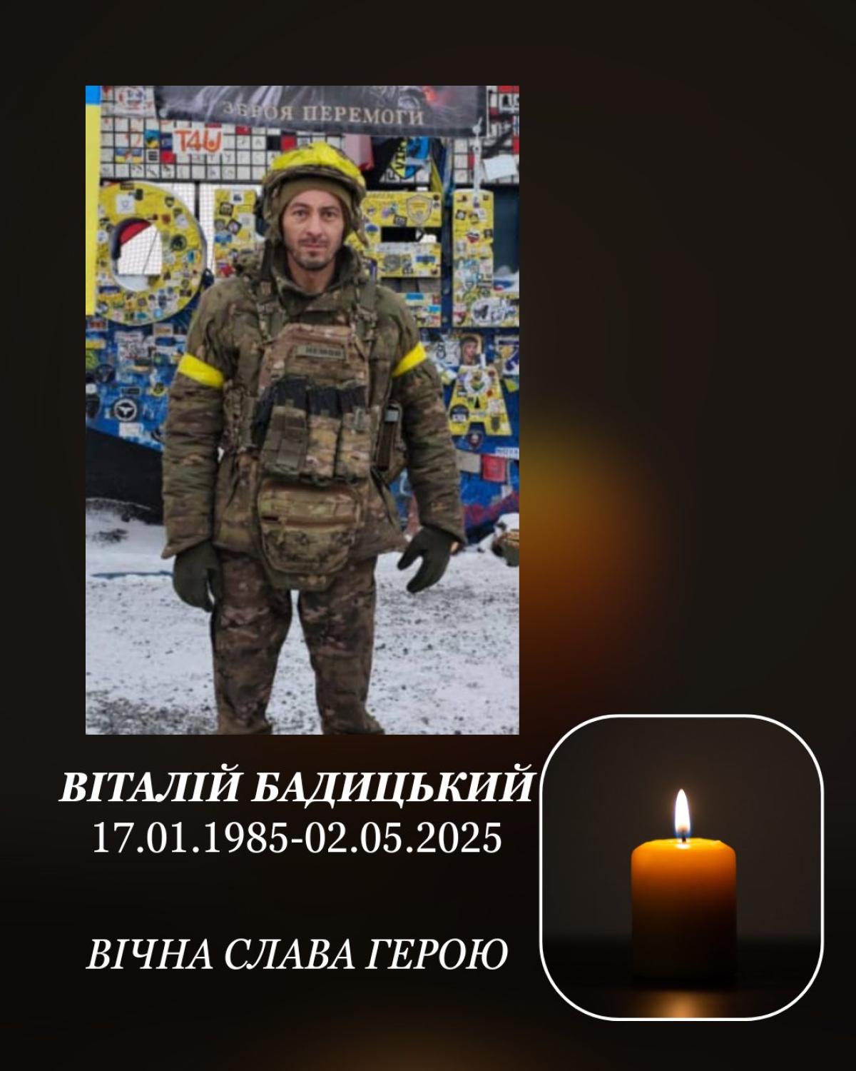 Виталий защищал Украину в составе противотанкового отделения противотанкового взвода батальона оперативного назначения бригады Нацгвардии "Спартан". Связь с ним прервалась в мае 2025 года. Почти год солдат Бадицкий считался пропавшим без вести. Семье сообщили, что военный погиб 2 мая 2025 года в результате вражеского удара КАБами возле села Удачное Покровского района Донецкой области. Это подтвердила ДНК-экспертиза.
