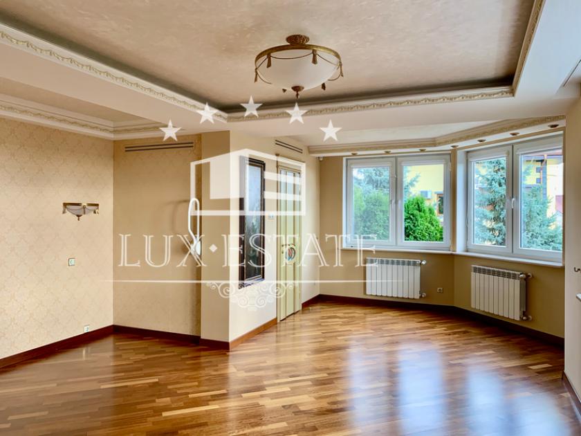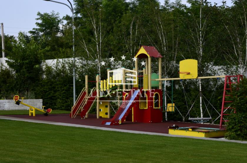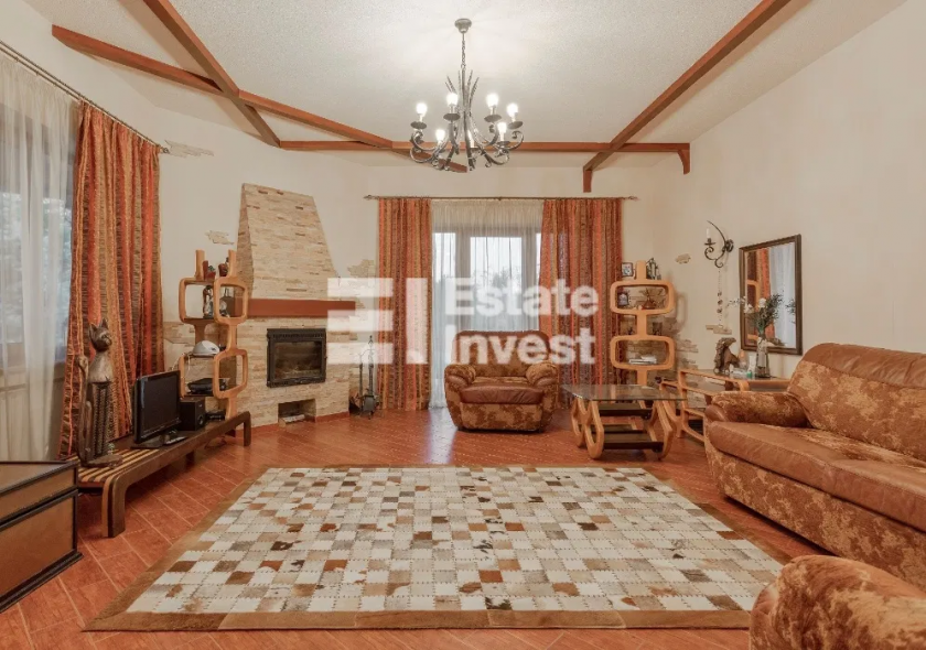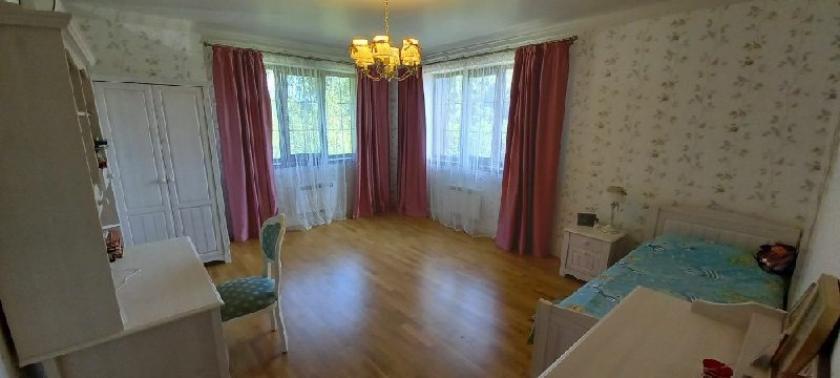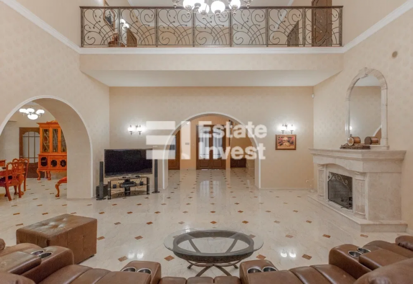 Двухэтажный дом в Лесопарке занимает 585 кв. м и имеет участок площадью 45 соток. На первом этаже расположены гостиная с камином, холл-прихожая, кухня-столовая с выходом на террасу, игровая, кабинет, 2 санузла, гостевые комнаты. На втором этаже: 4 спальни с санузлом и гардеробной и гостиная.