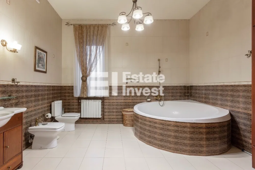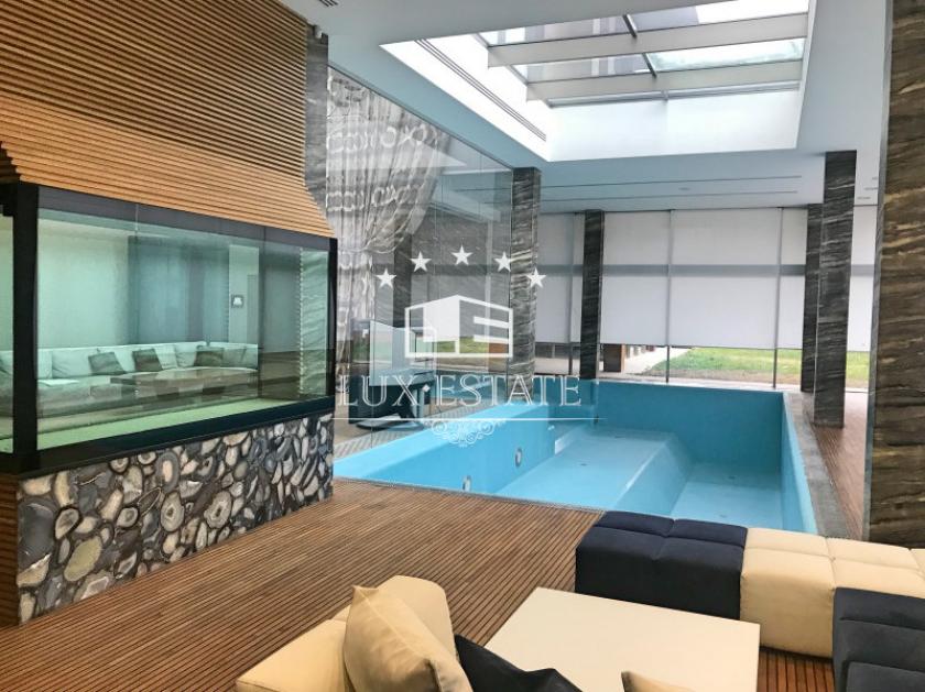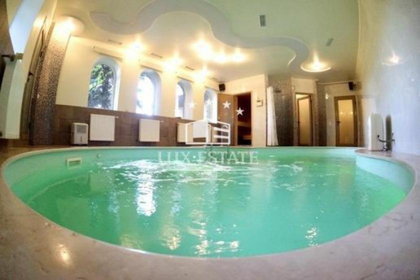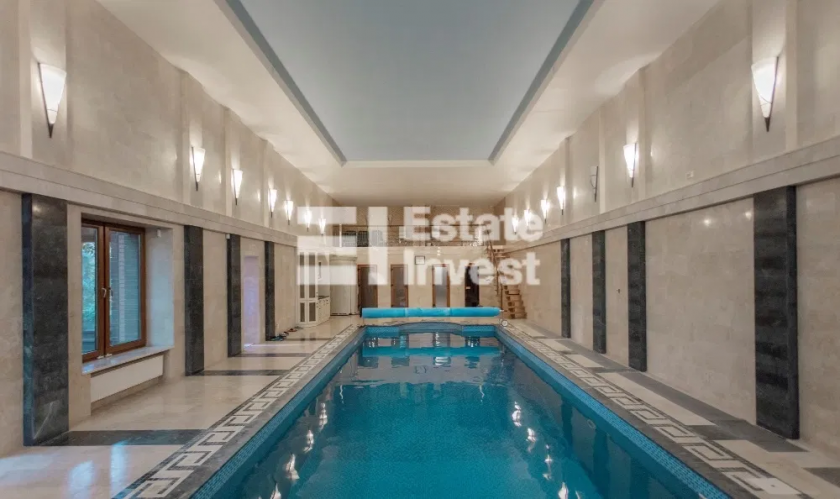 На участке 13,8 соток расположены крытый бассейн с сауной и джакузи, гараж, терраса, каскадный водопад.