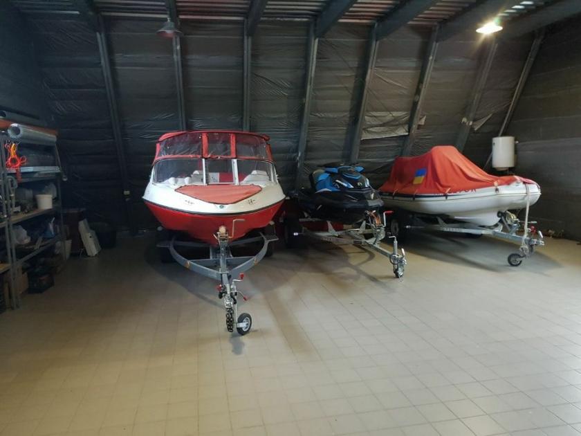 В основном доме два этажа. На первом: холл, гардеробная комната, кухня-столовая, гостиная с выходом на террасу, две спальни, санузел, постирочная, хозяйственная комната. На втором: две спальни, санузел, гардеробная комната. Гостевой дом оснащен бильярдной, баней, зоной SPA с бассейном, хранилище для лодок и катеров.
