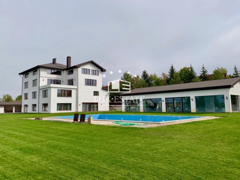 На участке 30 соток есть основной дом площадью 1043 кв. м и гостевой дом площадью 215 кв. м. Они были построены в 2013 году. В главном доме имеется бассейн, гараж на два автомобиля, бойлерная, баня, винный погреб и хоз. помещения, большая веранда.