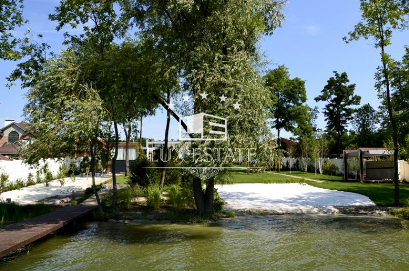 Участок площадью 50 соток находится на берегу водохранилища. Чтобы скрыть территорию от посторонних глаз, был высажен искусственный лес с множеством различных декоративных растений. Есть собственный пляж с белым песком, пирсом, детская и спортивная площадки, беседка для отдыха.
