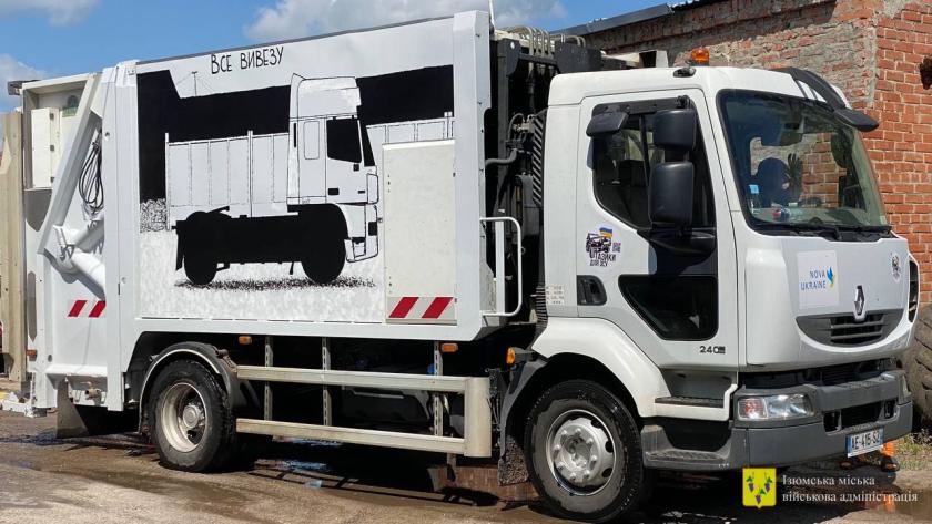 Деоккупированный город Изюм получил мусоровоз. Его подарила волонтерская группа "Тазики для ВСУ" и общественная организация Nova Ukraine (США). Автомобиль украшен рисунком харьковского художника Гамлета Зиньковского. На кузове машины изображен мусоровоз с надписью "Все вивезу".