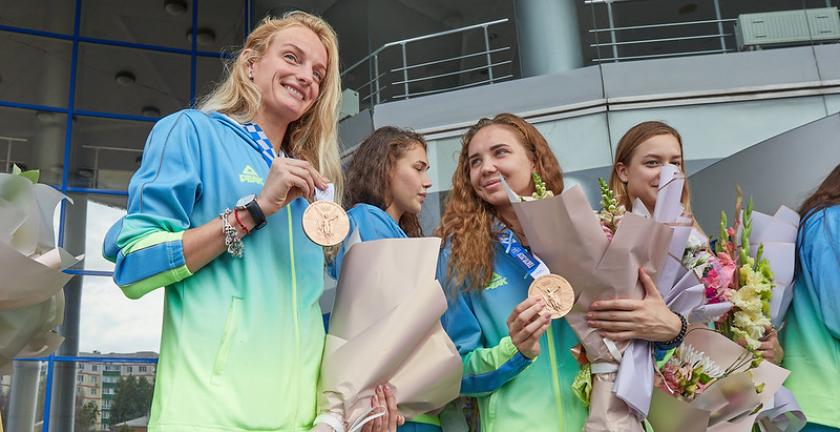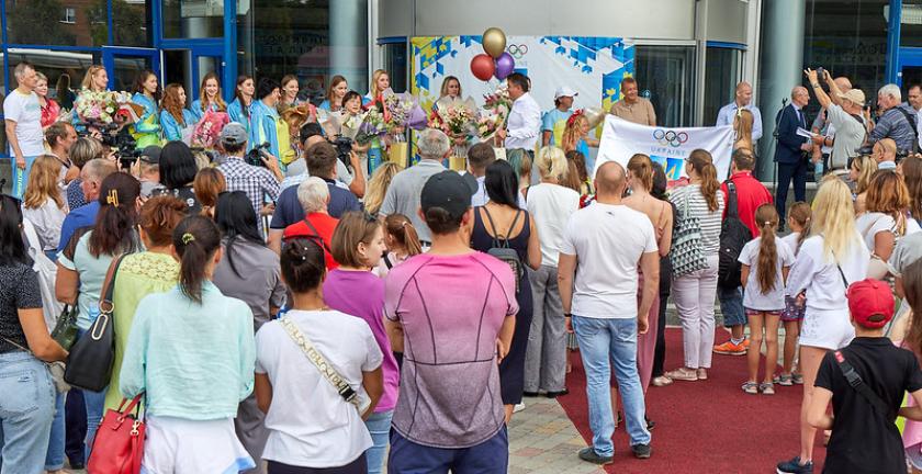 Возле Дворца спорта "Локомотив" (улица Большая Панасовская, 90/1) команду и тренеров ждали друзья, родственники и фанаты. Встречали "русалочек" цветами и аплодисментами. После официальной встречи с обладательницами олимпийских медалей фотографировались.