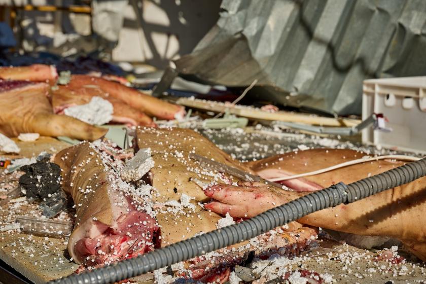 На предприятии разрушены линии производства, перекрытия и стены. На фотографиях можно увидеть мясную продукцию.