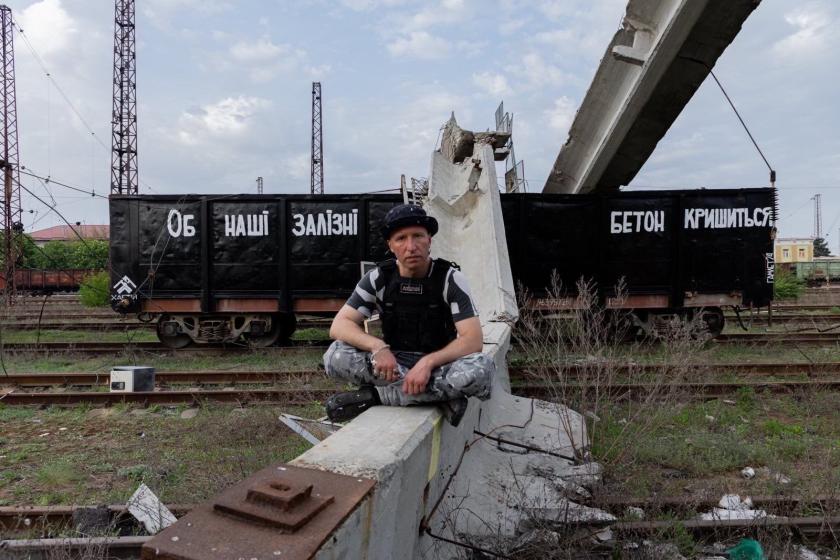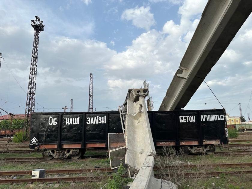 Гамлет Зинковский создал стрит-арт на вагоне, куда упал разрушенный российскими оккупантами бетонный мост.