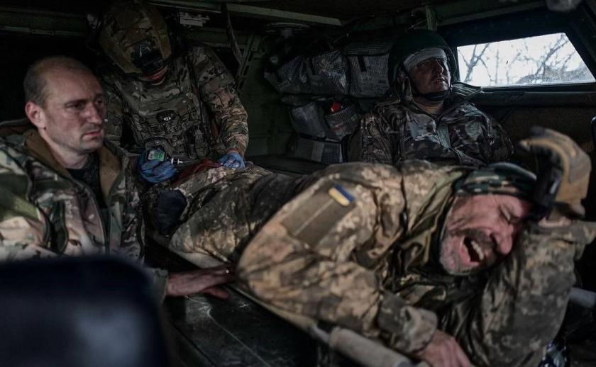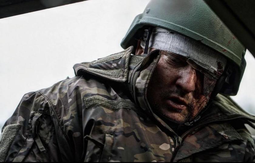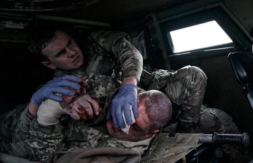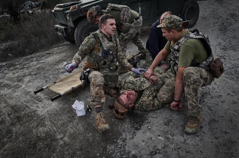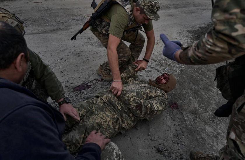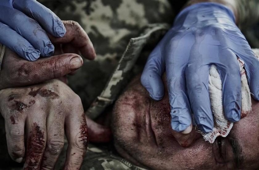На фото — бойцы с тяжелыми ранениями конечностей, головы, окровавленные носилки, сложные полевые условия, боль.