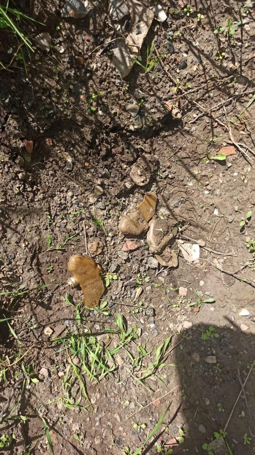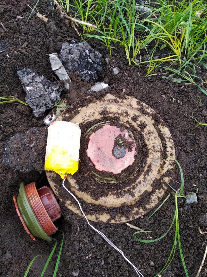 Полицейские показали видео разминирования одной из мин, найденной в кустах, а также мину на трассе М-20 Щербаковка-Харьков.