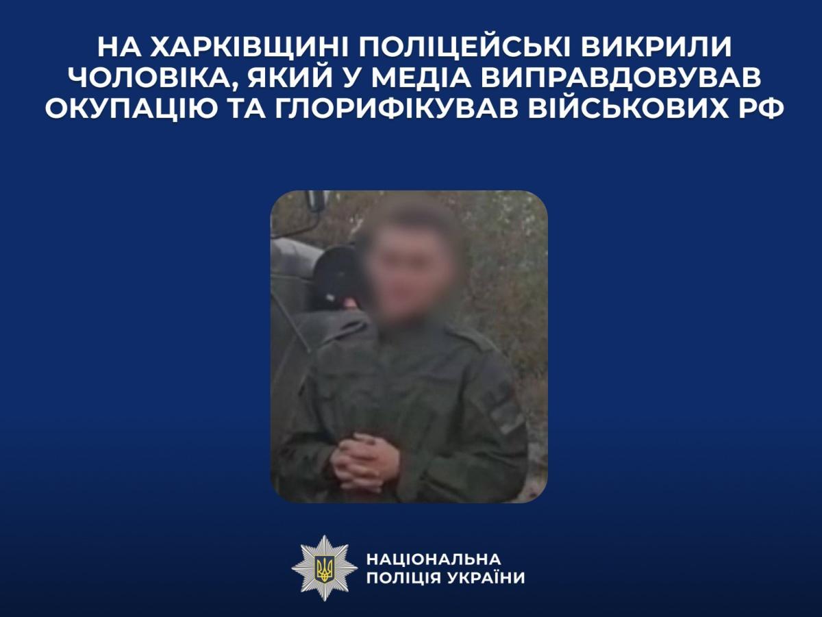 "Во время записи, которая впоследствии была обнародована в мессенджере "Telegram", молодчик называл вторжение в Украину освобождением русской земли от нацизма и фашистской идеологии. Он уверял: "Мы — единный русский народ. И сейчас, как никогда, важно сделать все для защиты нашей земли, нашей веры и наших ценностей". Согласно выводам комплексной судебной экспертизы видео- и звукозаписи, в высказываниях подозреваемого зафиксированы тезисы, прямо соответствующие пропагандистским нарративам рф", — сообщили в ГУ Нацполиции Харьковской области.