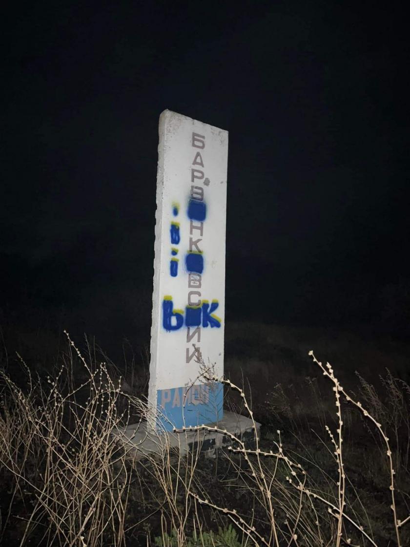 На территории Барвинковской громаді Изюмского района остается стела с названием ликвидированного района. На бело-голубой стеле написано: "Барвенковский район". Неизвестные оставили на ней украинские буквы в сине-желтом цвете, чтобы было понятно, что ее нужно демонтировать. Активисты проекта "Деколонизация. Украина" обещают прислать обращение с требованием убрать стелу.