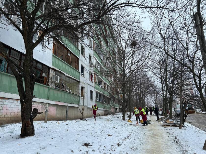Коммунальные и благотворительные организации подвезли OSB-плиты, волонтеры устроили возле дома пункт раздачи пищи и горячих напитков — ни тепла, ни света, ни воды в микрорайоне нет. Ракета попала в соседний дом, Проскуры, 7. После взрыва обрушился первый подъезд пятиэтажки. Спасатели целый день разбирали завалы — осторожно, почти без применения техники, потому что под обломками все это время были люди. Приблизительно в 11:15 из-под остатков дома достали живого мужчину. Спасатели на носилках отнесли его к машине "скорой" и вернулись назад, работы продолжаются до сих пор. Вокруг дома уцелевшие жители собирают остатки своего имущества и ищут потерянных животных.