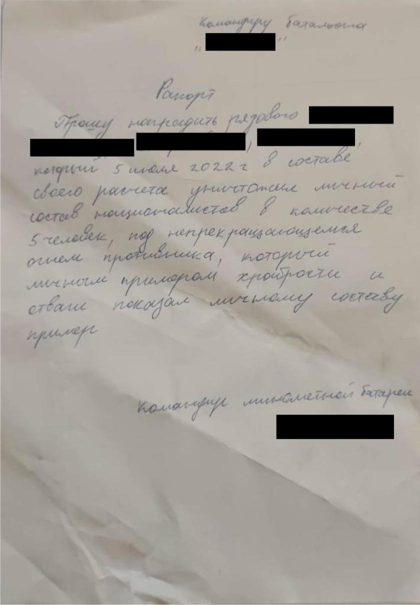 "Прошу наградить рядового, который 5 июля 2022 года в составе своего расчета уничтожил личный состав националистов в количестве 5 человек, под непрекращающимся огнем противника, который личным примером храбрости и отваги показал личному составу пример", — говорится в рапорте оккупанта.