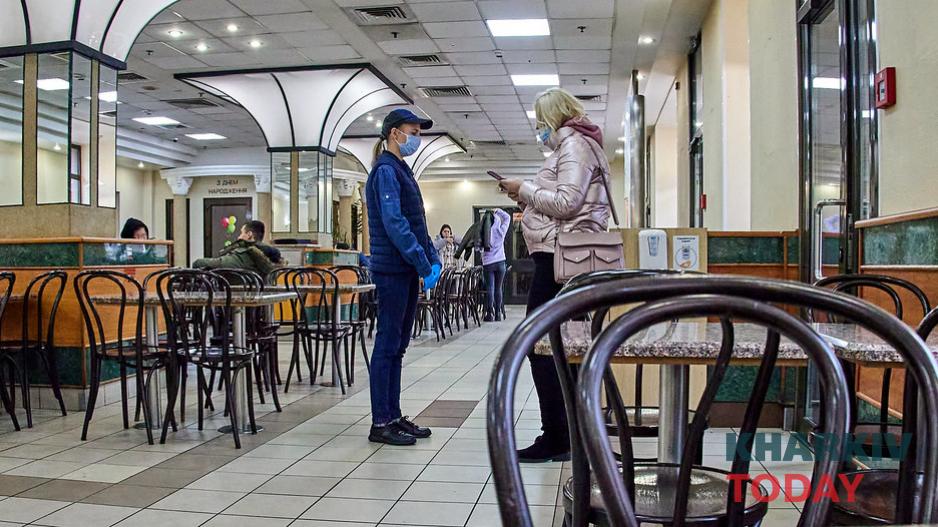 В последний день работы ресторана на площади Павловской, 6 немного людей, поскольку из-за карантинных ограничений туда пускают только по COVID-сертификатам. У входа гостей встречает сотрудник, чтобы проверить, есть ли у них нужные документы, потом людей пускают к кассам, где они могут выбрать и заказать еду.