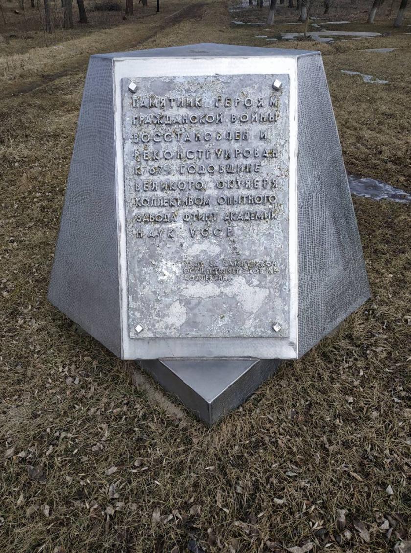"Памятник героям гражданской войны восстановлен и реконструирован к 67-й годовщине Великого Октября коллективом опытного завода "Фтинт" Академии наук УССР. Уход за памятником осуществляет этот коллектив", — отмечалось на доске.
