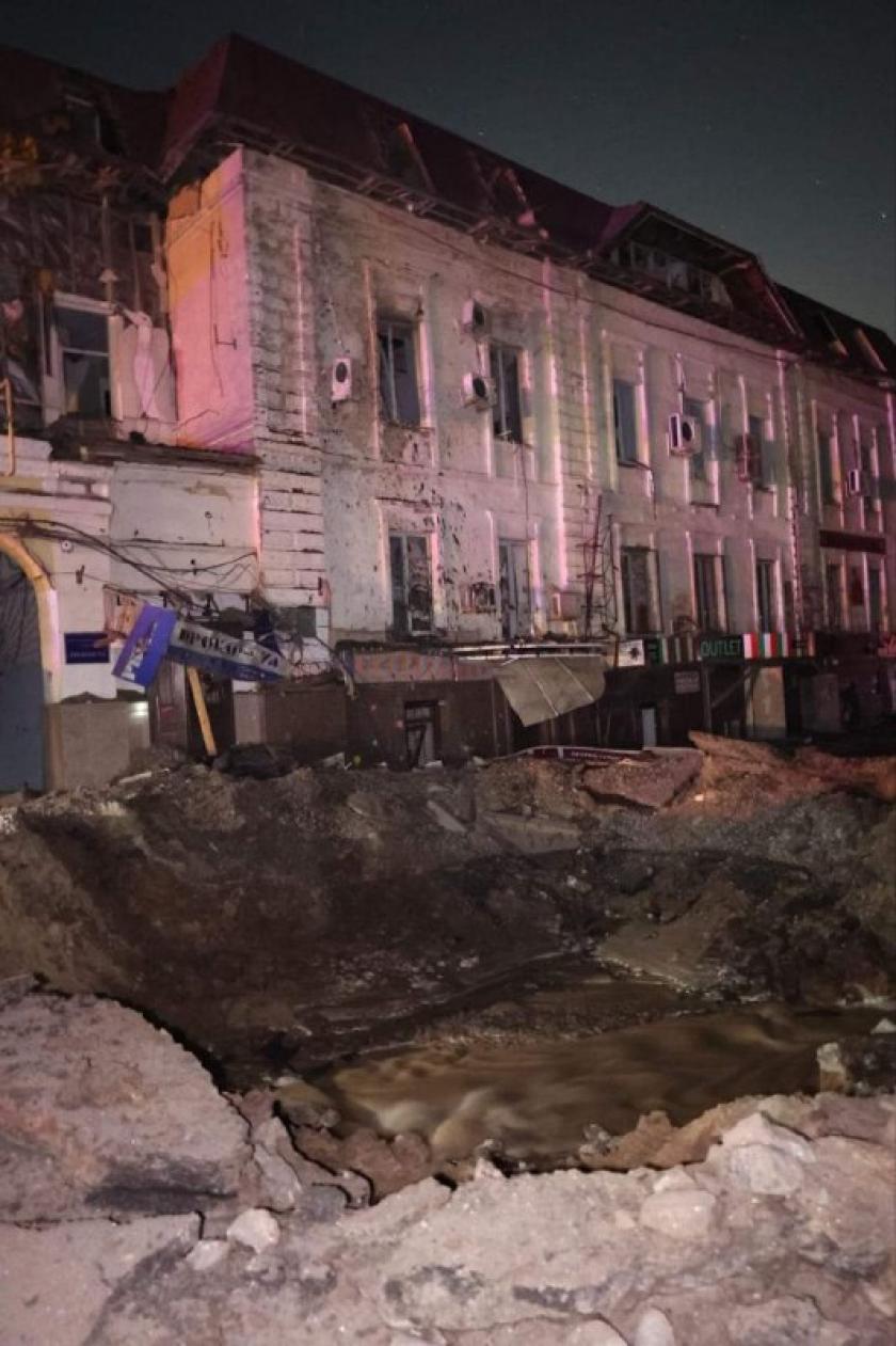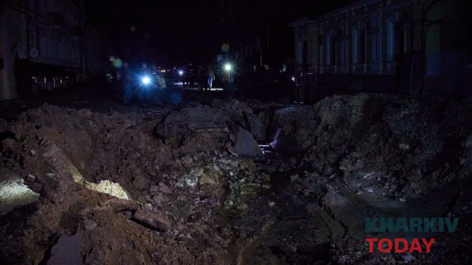 После полуночи стало известно, что одна из ракет попала в старую часть Харькова, недалеко от ХНАТОБа, на улицу Рымарскую, и повредила водопровод. Огромная воронка образовалась напротив паба "Стена", где в 2014 году был теракт. Ночью коммунальники приступили к работе.