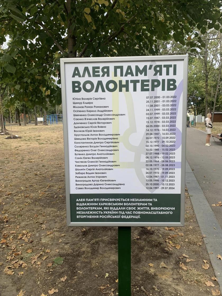 Накануне в Молодежном парке в Харькове открыли Аллею памяти волонтеров. Об этом сообщила председатель правления в БО "БФ "Станция "Харьков" Алла Фещенко.