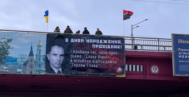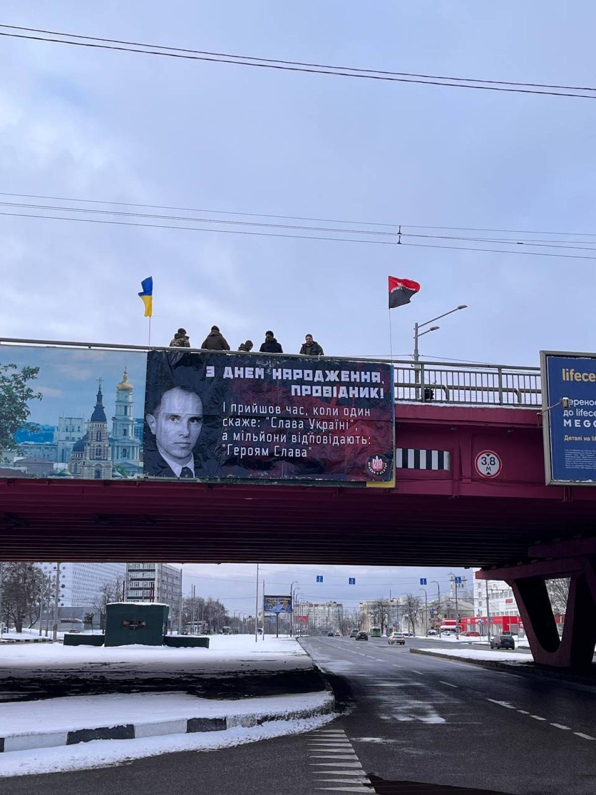 Активисты вывесили на мосту на проспекте Героев Харькова баннер с портретом Бандеры и его перефразированным высказыванием-пророчеством: "И пришло время, когда один скажет: "Слава Украине!", а миллионы ответят: "Героям слава!"