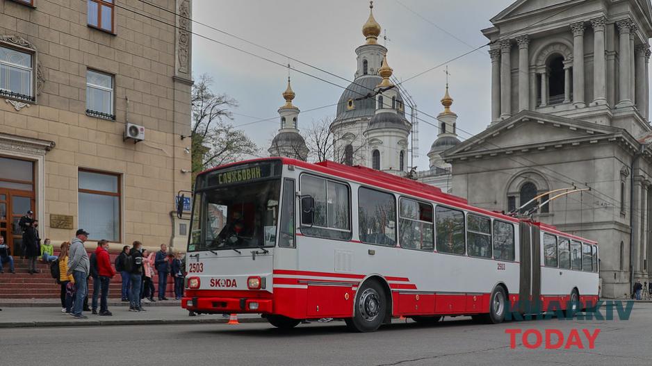 Утром 1 мая троллейбусы современных и старых моделей отправились по самому первому в городе маршруту — от улицы Университетской по Сумской до парка им. Горького. Бесплатно проехаться в колонне могли все желающие.