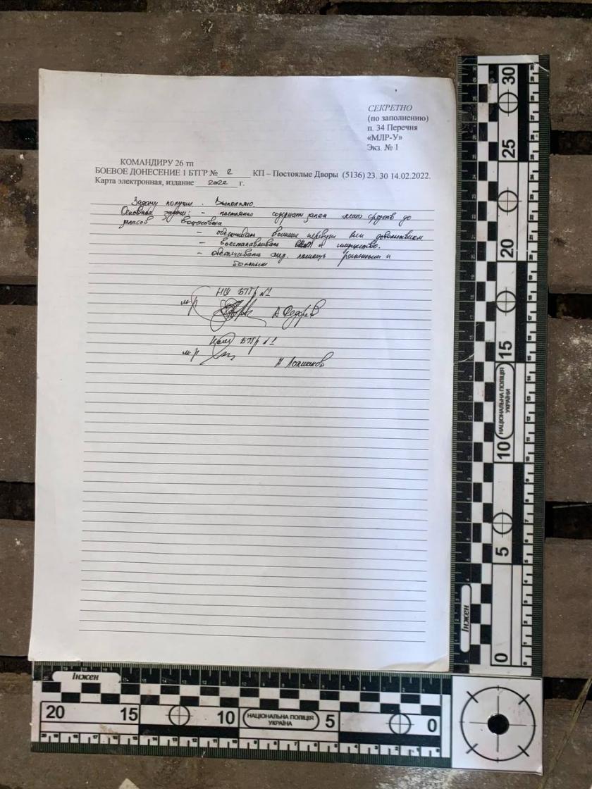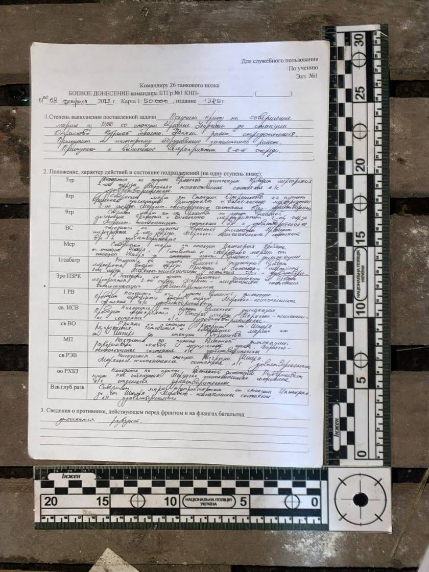 "Среди выявленных вещественных доказательств — секретное боевое распоряжение военных РФ на вторжение в Украину, топографическая карта Харьковской области по маршруту движения, списки личного состава военнослужащих танковых бригад вооруженных сил России, документы структурных подразделений ВГА Изюмского района, учебных заведений, медицинских учреждений, предпринимателей и коммунальных предприятий", — рассказали в полиции.