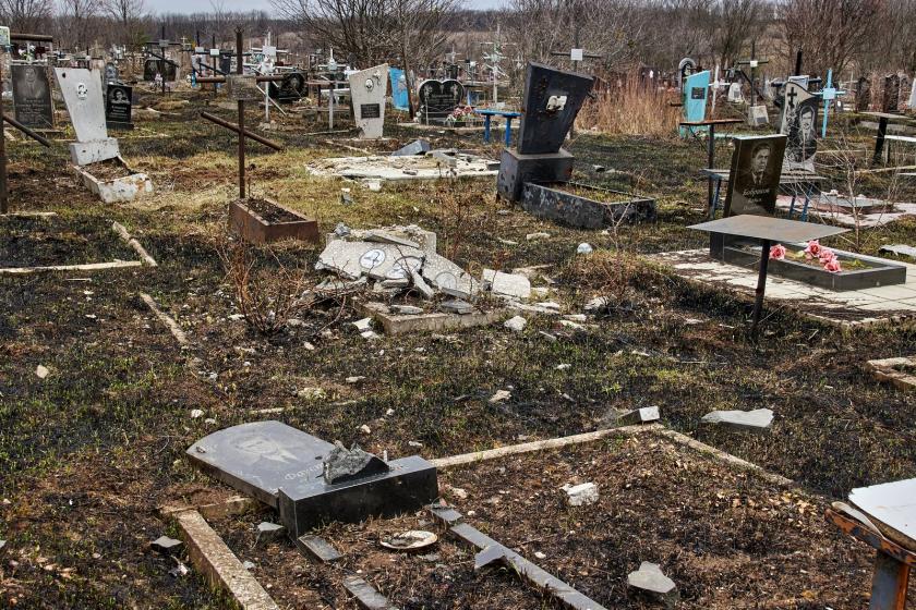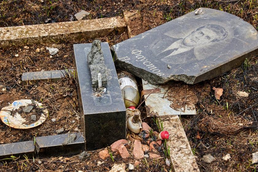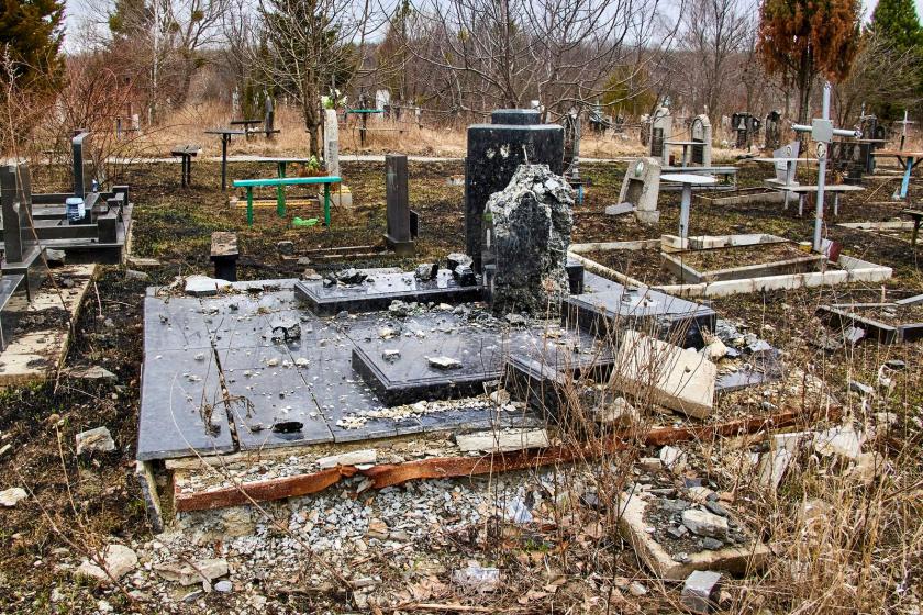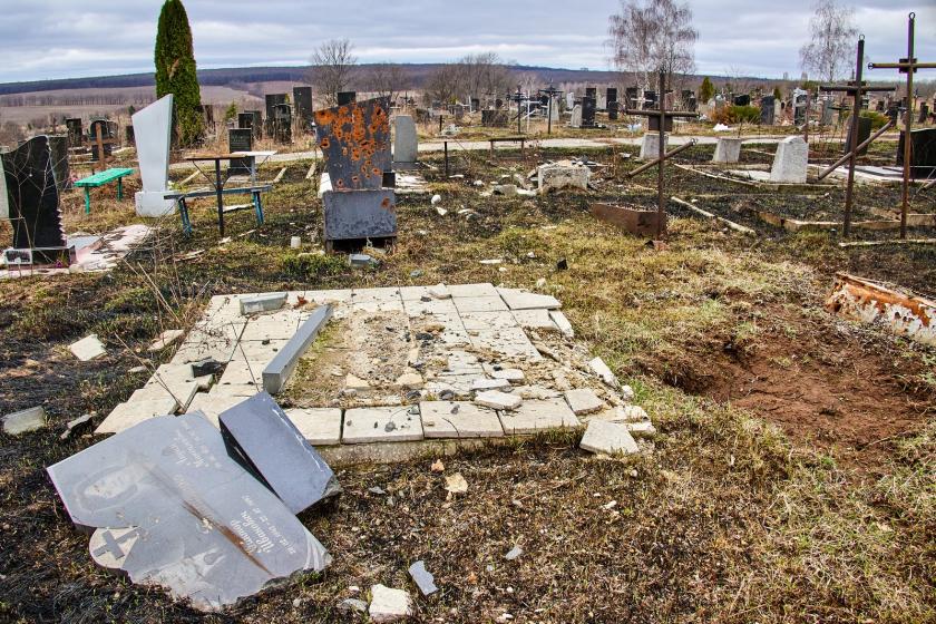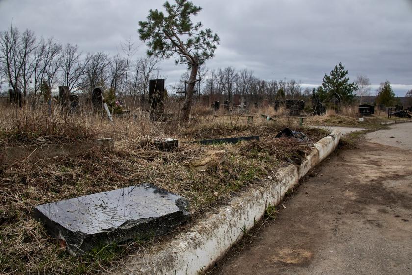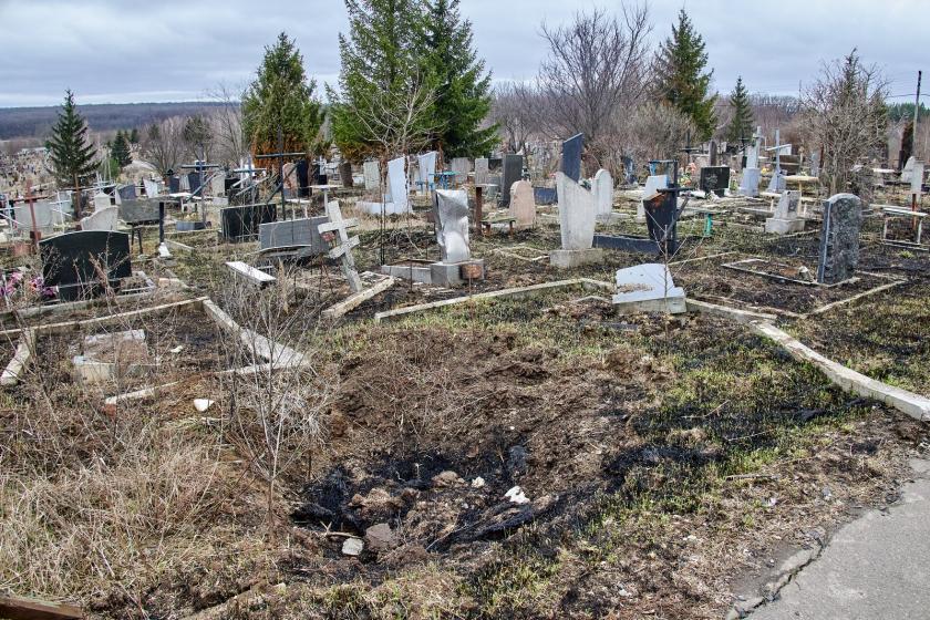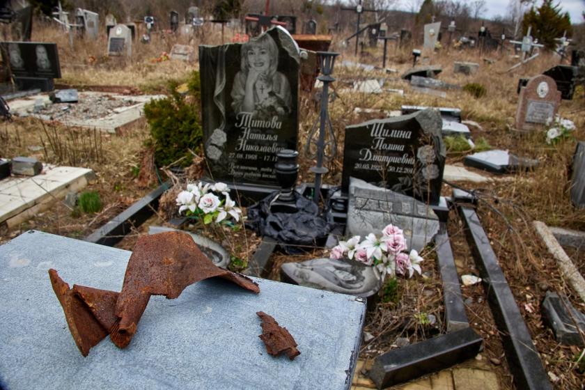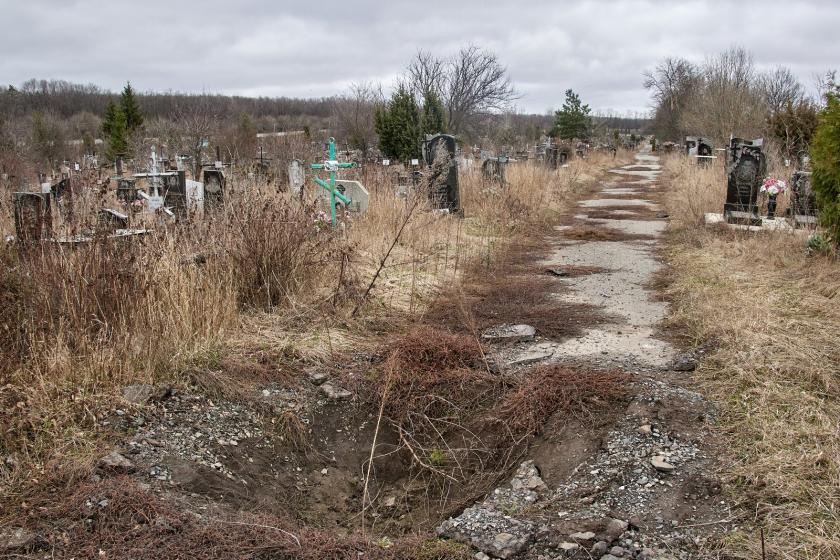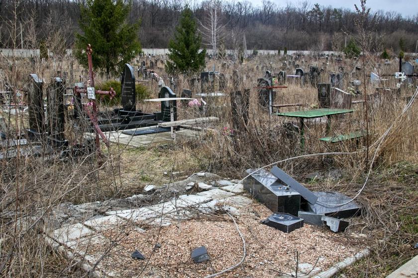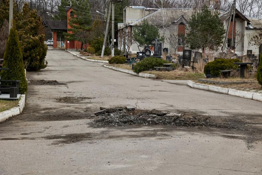 На крупнейшем городском кладбище №17, которое находится возле Окружной, сейчас висит большая вывеска о том, что вход-въезд запрещен из-за опасности. На аллеях между рядами могил виднеются воронки от разрывов российских снарядов. Многие могилы и надгробные плиты повреждены, некоторые разбиты и повалены.