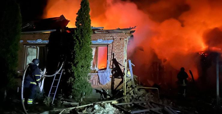 Около 02:25 российские военные нанесли удар беспилотником "Герань-2" по поселку Золочев. Вспыхнул пожар, разрушивший два жилых дома.