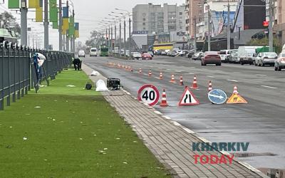 На распределительной полосе вместо натуральной травы положили искусственную. -