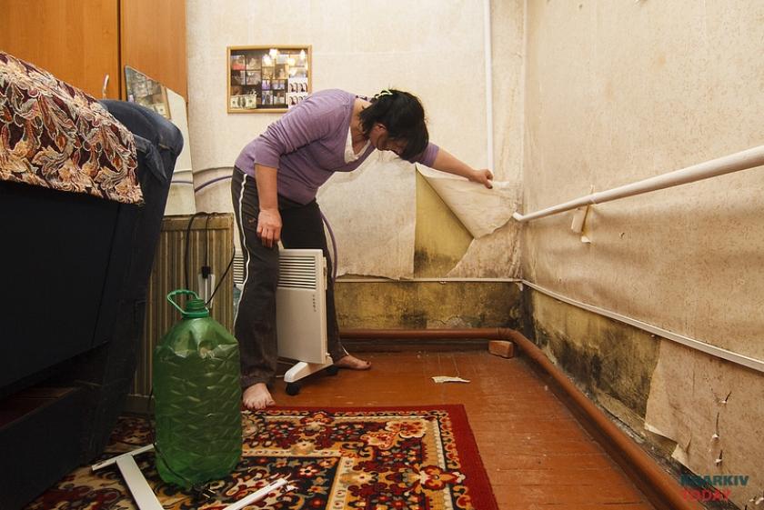 Мы застаем работницу УТОСа Людмилу Лещенко как раз за уборкой коридора. Незрячая жительница общежития соглашается показать нам свою комнату. На первый взгляд, так живут многие обитатели общежитий и коммуналок – очень плотно расставлена мебель, здесь же теснятся холодильник и компьютер, и даже для большого аквариума – страсти хозяйки помещения – нашлось место. Нельзя сказать, что здесь неуютно, но – только до того момента, пока Людмила Лещенко не отодвинет диван. Светлые обои свисают со стен клочьями, под ними – сырая стена и плесень.