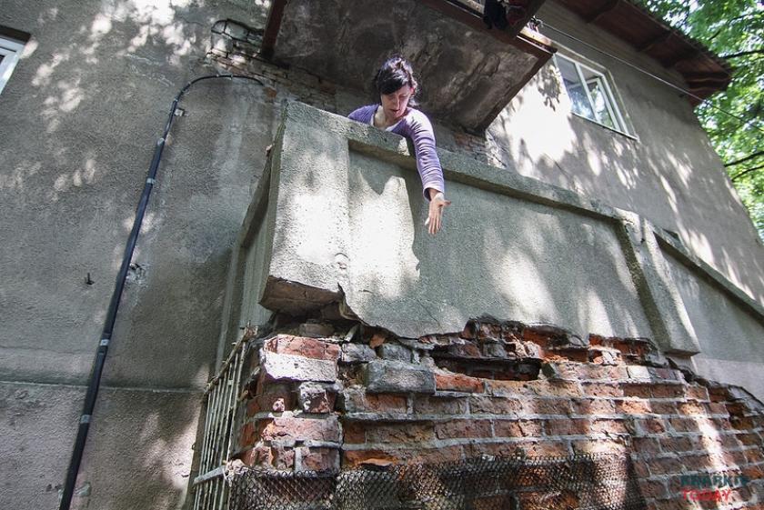 Тот самый сосед, который всю зиму просидел под текущими с потолка струями воды, Валерий Мороз, курит на балконе. Выйти на него страшно – между кирпичами на полу видны дыры.