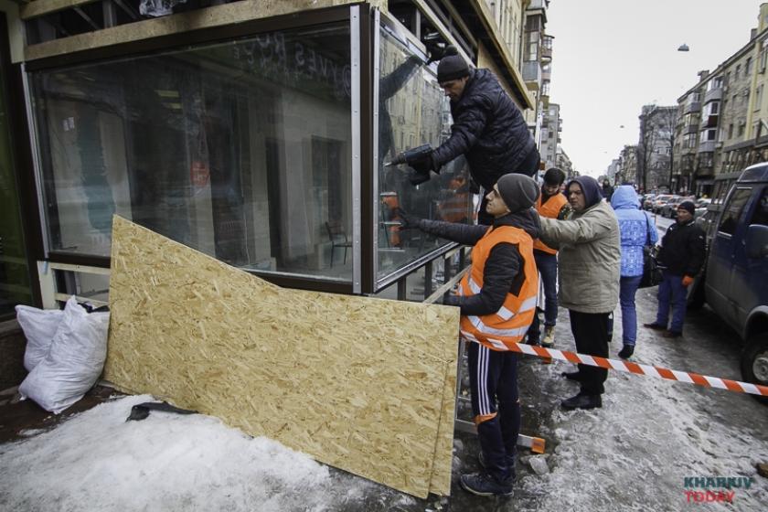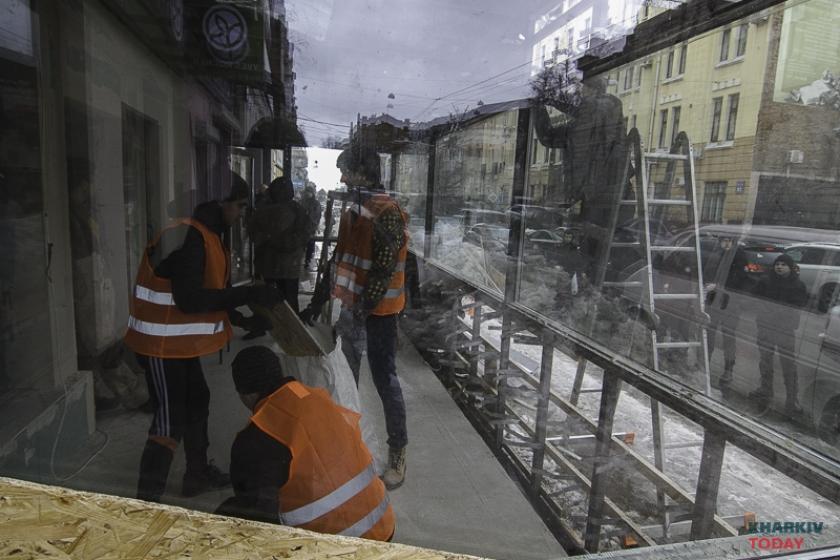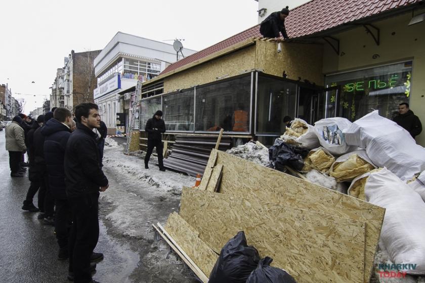 16 марта сотрудники частной фирмы в сопровождении активистов из "Східного корпуса" начали демонтаж пристройки в центре Харькова. Напомним, веранда на Пушкинской, 58 появилась несколько месяцев назад, тогда прежняя метровая веранда была расширена еще примерно на метр. В результате наглых действий владельца общепита пешеходам осталось около метра тротуара для прохода. Закончить строительство пристройки так и не успели. Депутат Дмитрий Булах обратился в горсовет с запросом о законности строения.