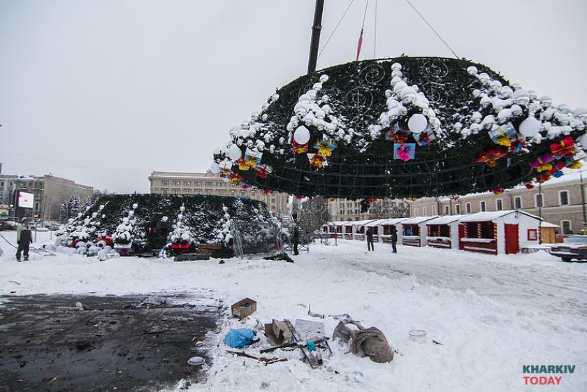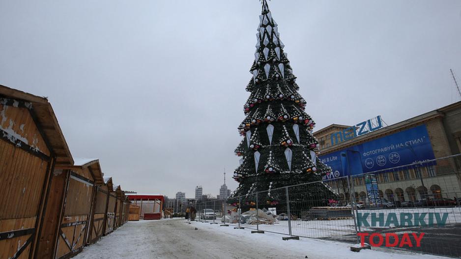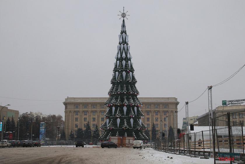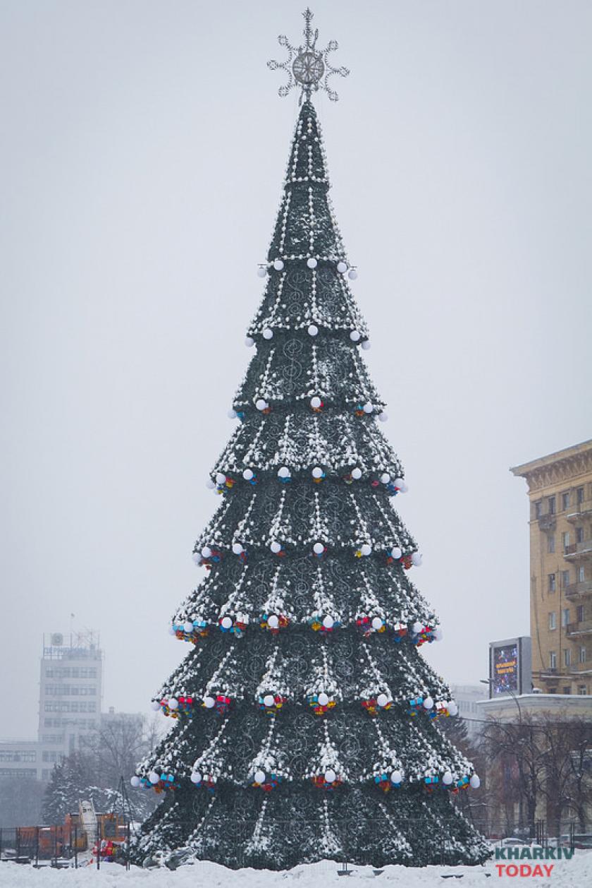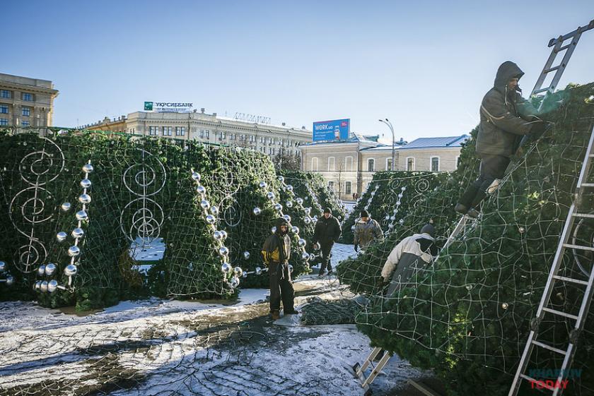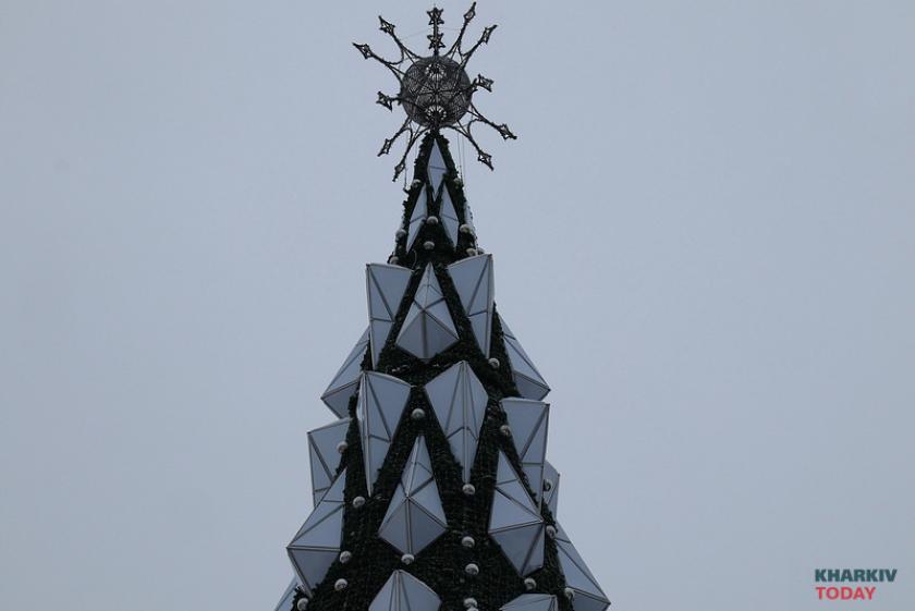 Харьковчане уже могут рассмотреть новую искусственную ель на площади Свободы - на ней появились новые детали, но очертания конструкции отчетливо напоминают прошлогоднюю.