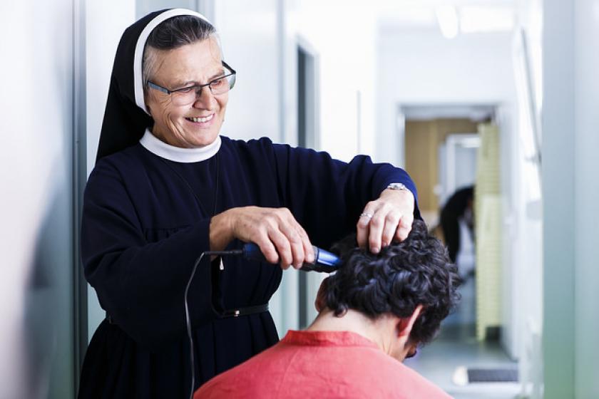 Внутри обстановка очень простая, если не сказать аскетичная. Нет ничего лишнего: стулья, столы, распятие... Пахнет свежим обедом. Сестра Сабина желает приятного аппетита и отправляется делать перевязку пенсионерке. Едва монахиня заканчивает процедуру, как один из посетителей просит, чтобы его подстригли. Кроме бездомных и пенсионеров у социального центра собралась группа женщин с детьми – переселенцы с Донбасса. Они получают от монахинь продуктовые пакеты и памперсы.