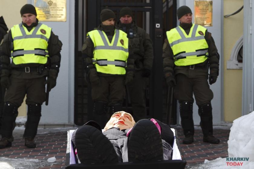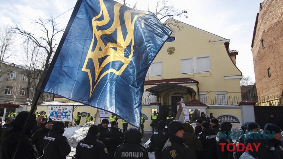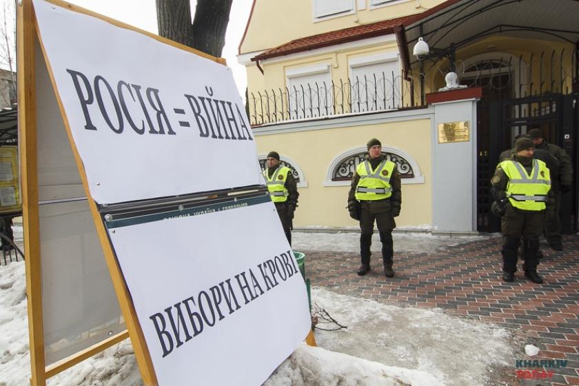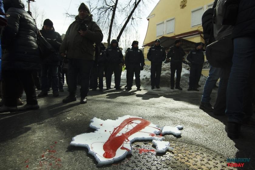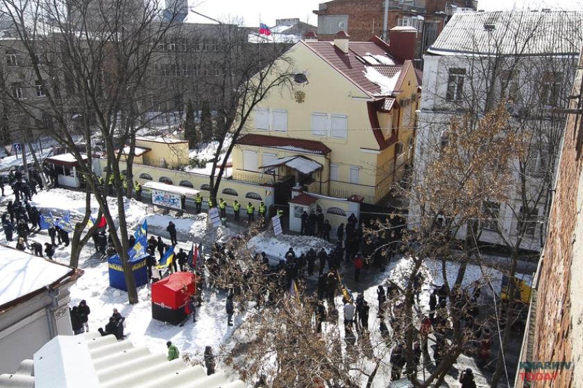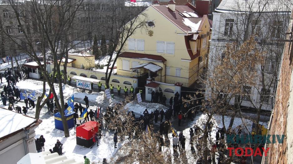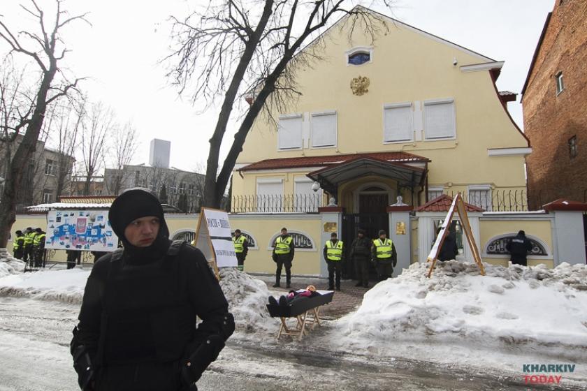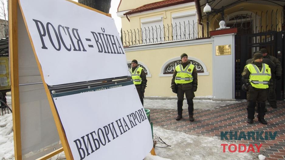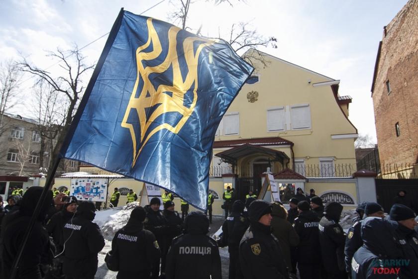 В воскресенье, 18 марта, в день выборов президента в России националисты блокируют генкосульство РФ в Харькове. Фотограф KHARKIV Today побывал на акции.