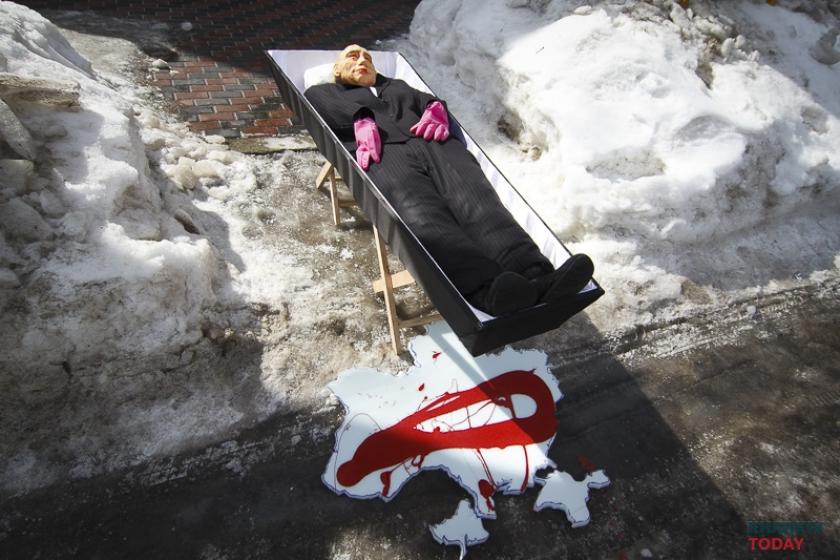 Националисты - представители ВО "Свобода", "Правого сектора" и "Национального корпуса" - начали подходить к генконсульству РФ на улице Максимилиановской с самого утра. К дипучреждению принесли "гроб с Путиным" и карту Украины в "крови", а припаркованный рядом автомобиль дипмиссии раскрасили надписями "Крым наш".