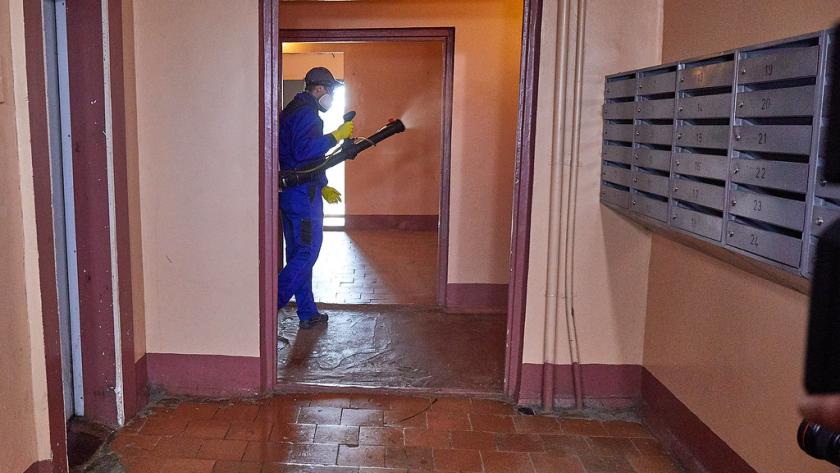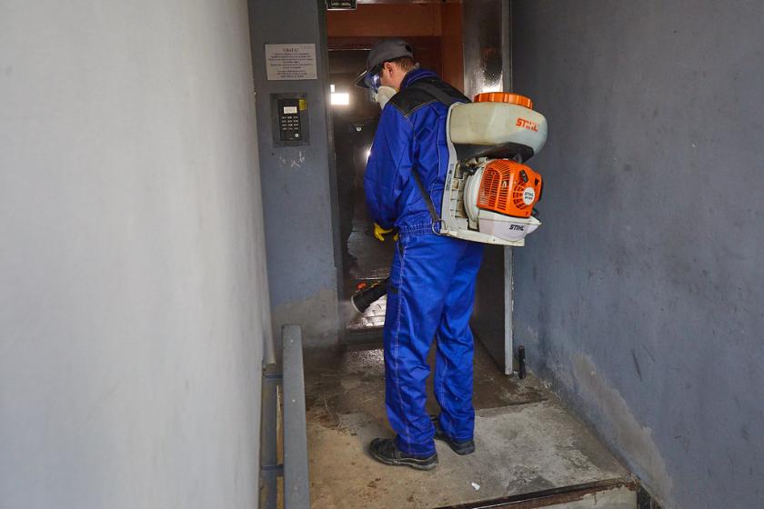 Пять бригад дезинфекционной службы обрабатывают подъезды раствором аммония. На все про все уходит от 20 до 40 минут.
