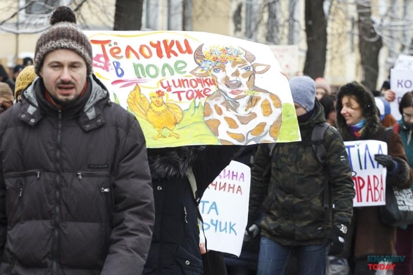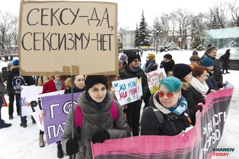 В руках они держали плакаты «Сексу - да, сексизму - нет», «Гори, патриархат», «Сестри і брати рівні в боротьбі», «Телочки в поле, цыпочки - тоже» и другие.