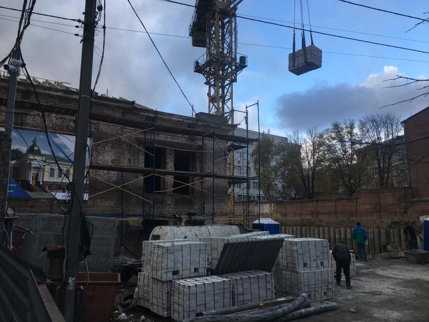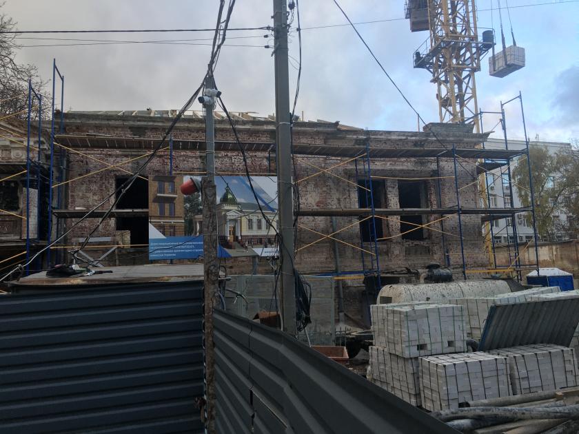 Вокруг памятника архитектуры установлены строительные леса. Фасад здания очищен до кирпича.