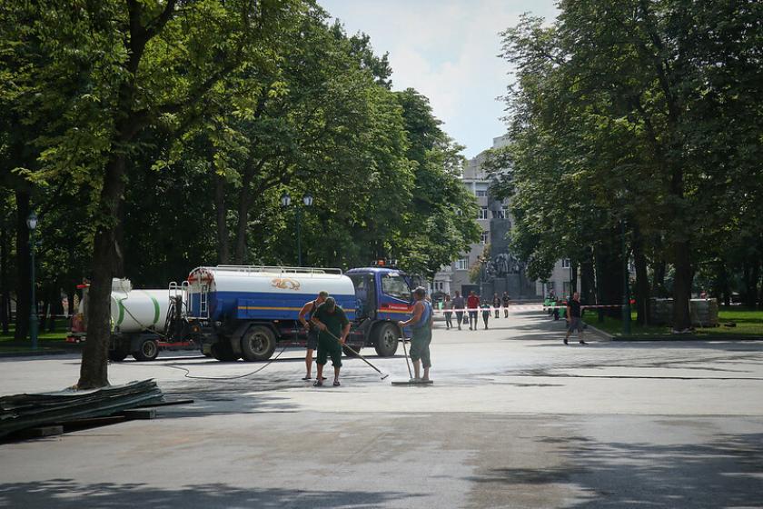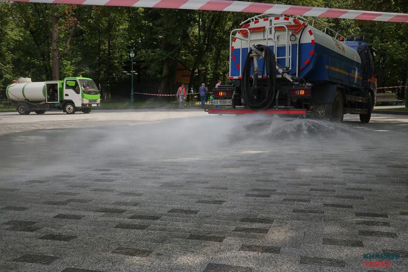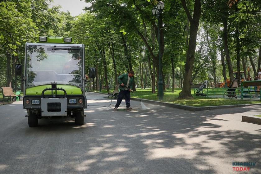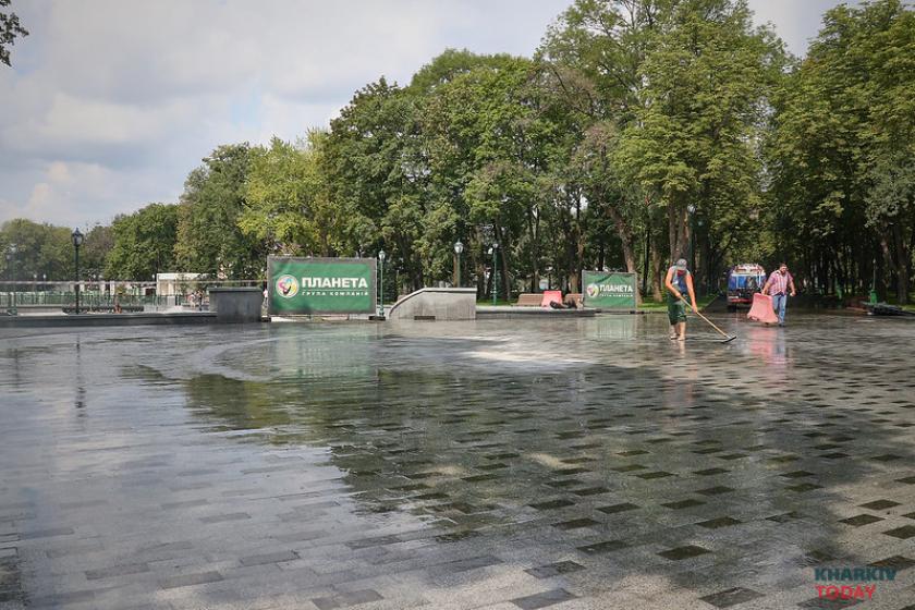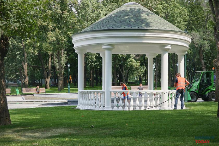 Сотрудники коммунальных служб приводят в порядок реконструированный сад Шевченко. По словам одного из рабочих, его откроют 18 июля.