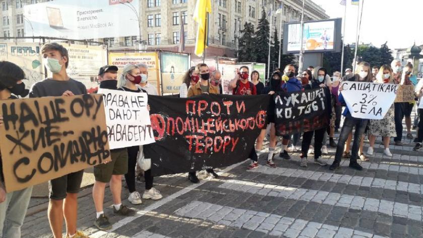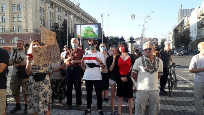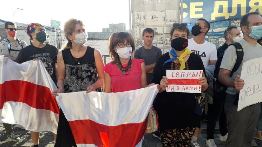 Люди принесли с собой флаги Украины и исторические национальные бело-красно-белые флаги Республики Беларусь. Активисты держали в руках плакаты с надписями: "Сябры! Ми з вами!", "Стоп тарган", "Жыве Беларусь", "Беларусь, Україна з тобою!", "Проти поліцейського терору" и другие. Они скандировали: "Слава Україні" и "Жыве Беларусь".