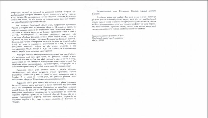 "Наше обращение обусловлено обострением в стране. Во многих городах были проведены акции "Нет капитуляции". Много организаций обратились и начали пугать третьим Майданом. Они снова хотят делить украинцев, вводят их в обман. Они стремятся к войне, чтобы снова делить украинцев на патриотов и «зрадників» или «сепаратистов». Горсовет заявляет: Харьков пережил тяжелую весну 2014 года и остался под украинским флагом. Харьков помогал бойцам на передовой, обеспечивал АТО и ООС тяжелой техникой, Харьков похоронил многих сыновей и дочерей. Мы знаем цену этой войны. Но в последние месяцы мы почувствовали надежду на мир. Президент и его команда добились улучшения ситуации на передовой. Во время марафона Зеленский заявил, что он победил благодаря тому, что обещал стать президентом мира. Мы поддерживаем и считаем формулу единственным путем к окончанию войны и прекращению огня. Контроль на украинской границе защитит от дальнейшего противостояния на Востоке и обеспечит проведение выборов под прицелом ОБСЕ и вернет Украине неконтролируемые территории. Мы понимаем, какое давление осуществляют те, кто зарабатывают на войне. Горсовет призывает коллег поддержать усилия Зеленского в его деятельности на пути возвращения мира, а те горсоветы, кто принял решение о недопущении, отозвать эти документы. И воздержаться от акций "Ні капітуляції". Отказ от формулы лишит президента поддержки мировых лидеров. Владимир Зеленский, Харьковский горсовет поддерживает все ваши усилия. Мы будем воплощать в жизнь все ваши начинания по мирному урегулированию", - зачитал Кернес.