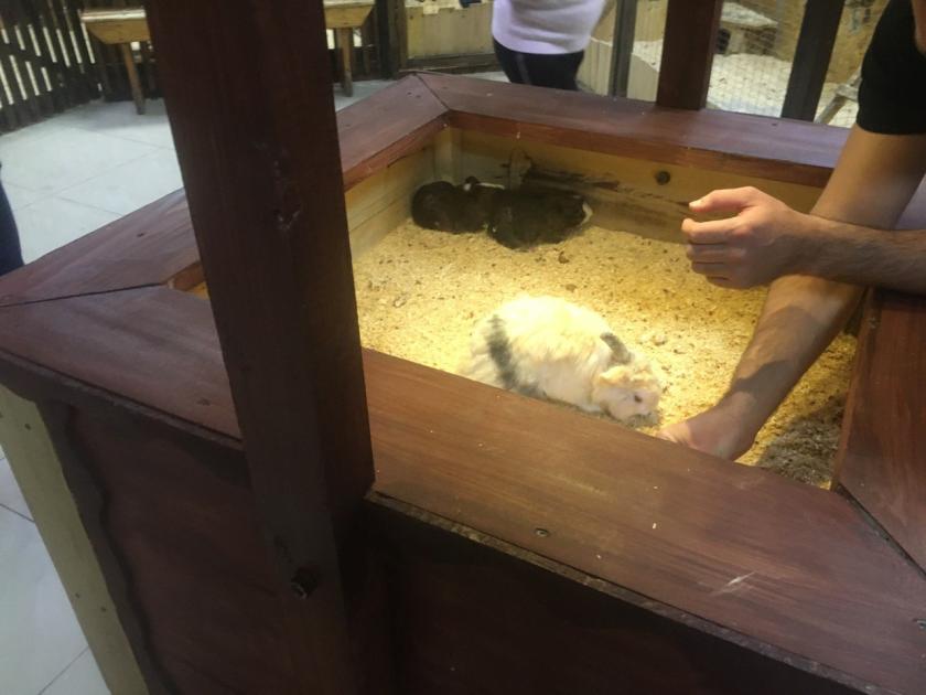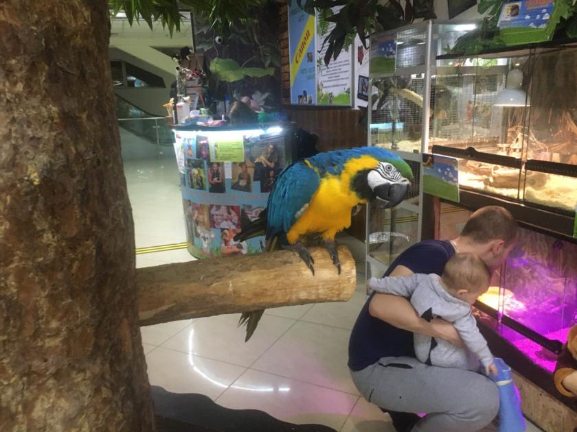 На третьем этаже ТРЦ в небольшом помещении под вывеской "Трогательный зоопарк" расположились клетки с грызунами и террариумы со змеями, рептилиями и крокодилом. Вход в зоопарк стоит 80 гривен. За стеклом обитают попугаи и голуби, а в отдельном открытом вольере с невысоким ограждением можно увидеть пекари, кроликов и морских свинок. Здесь животных можно погладить и даже покормить специальным кормом. Ну а "вишенкой на торте" является тот самый львенок Симба, который живет в весьма скромной "квартире" — отгороженные сеткой несколько квадратных метров. За 150 гривен любой посетитель может войти в клетку, чтобы погладить хищника или сделать селфи. Так — ежедневно, 10 часов в сутки.